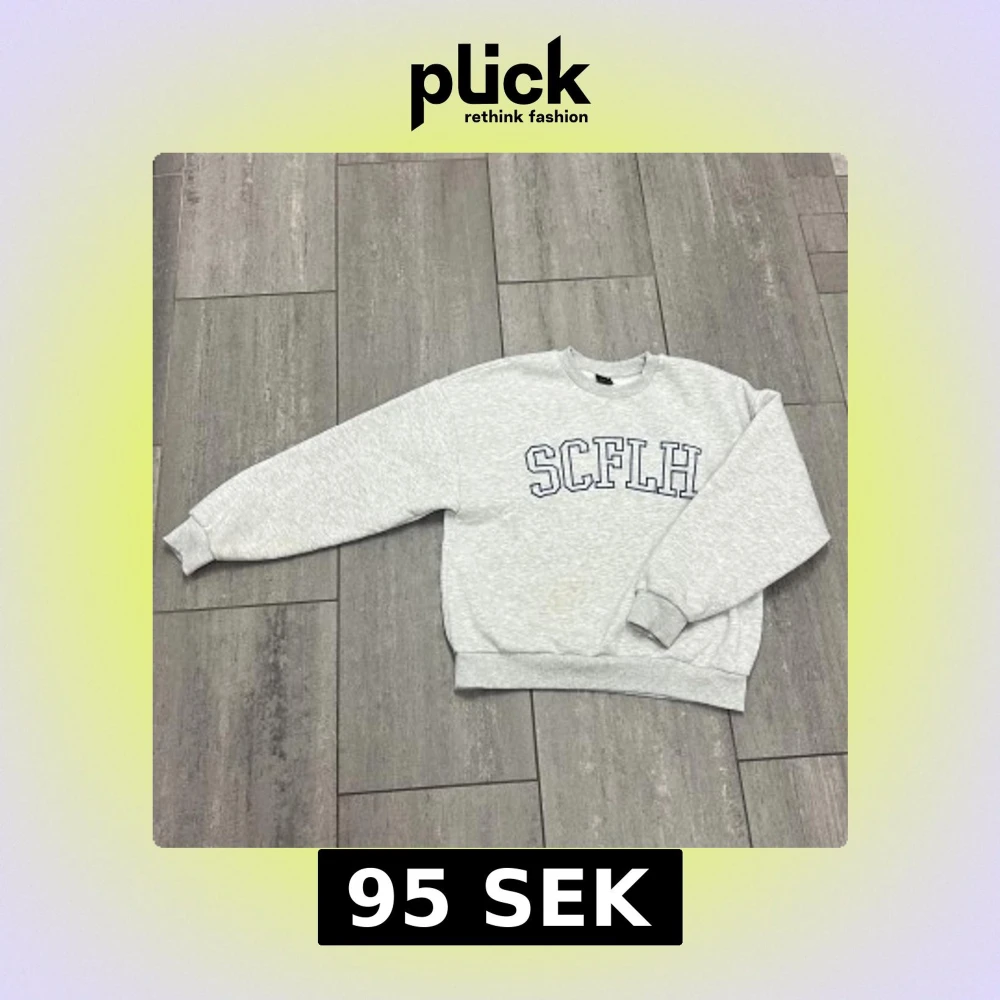 Ljusgrå sweatshirt från Gina Tricot i storlek M med SCFLH-tryck i mörkblått framtill. Klassisk rund halsringning, ribbade muddar och mjuk insida. Perfekt för en chill och avslappnad look.