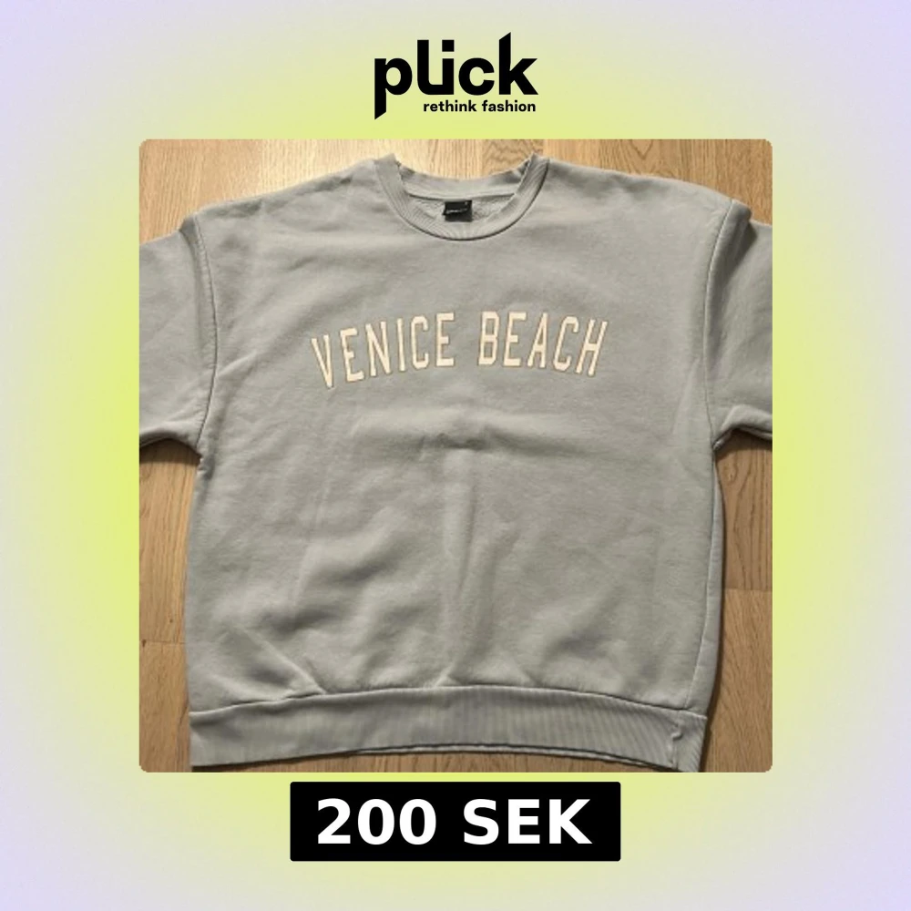 Säljer en ljusgrå sweatshirt från Gina Tricot med trycket 'Venice Beach' i vitt framtill (aldrig använt)! Tröjan har rund halsringning, ribbade muddar och en relaxed passform.