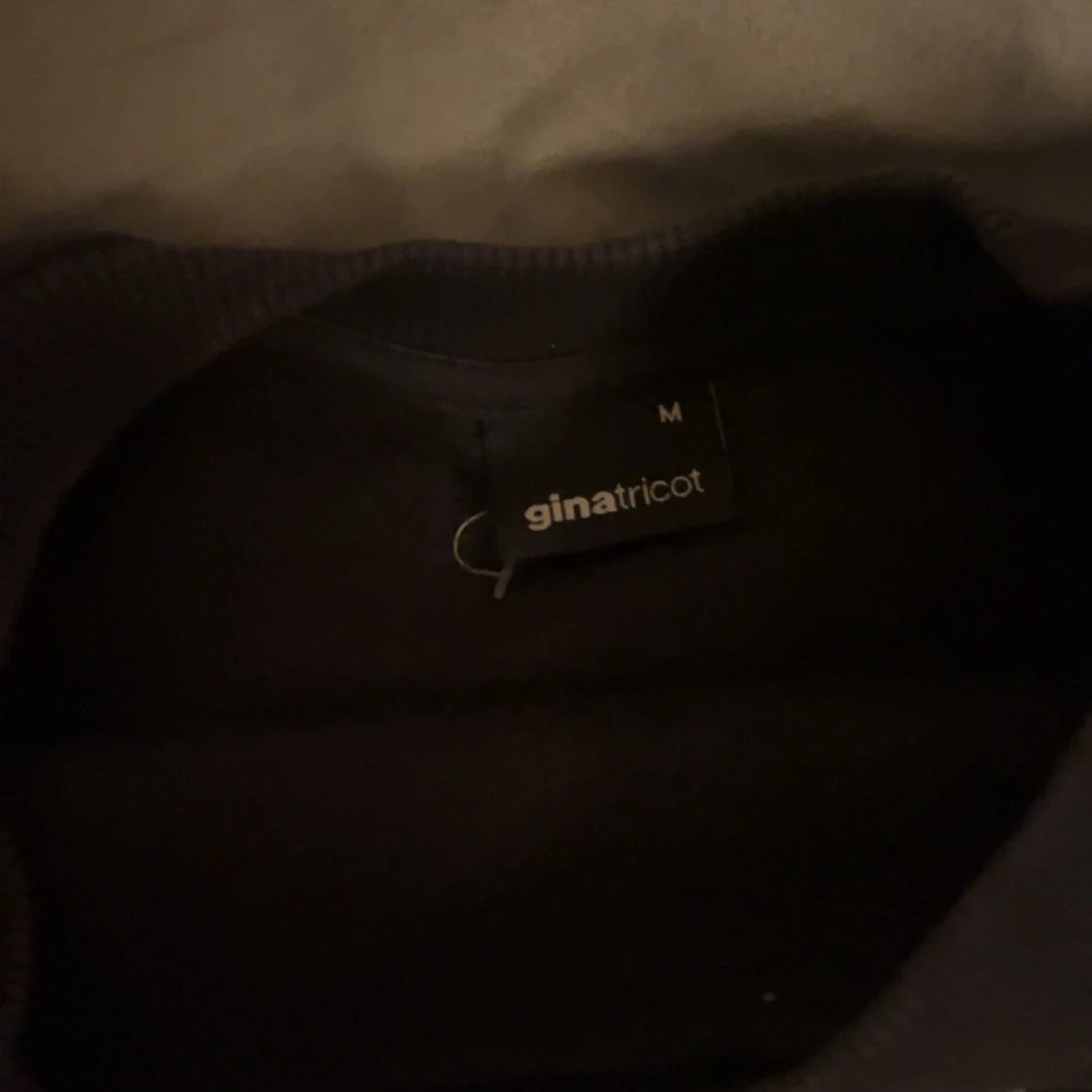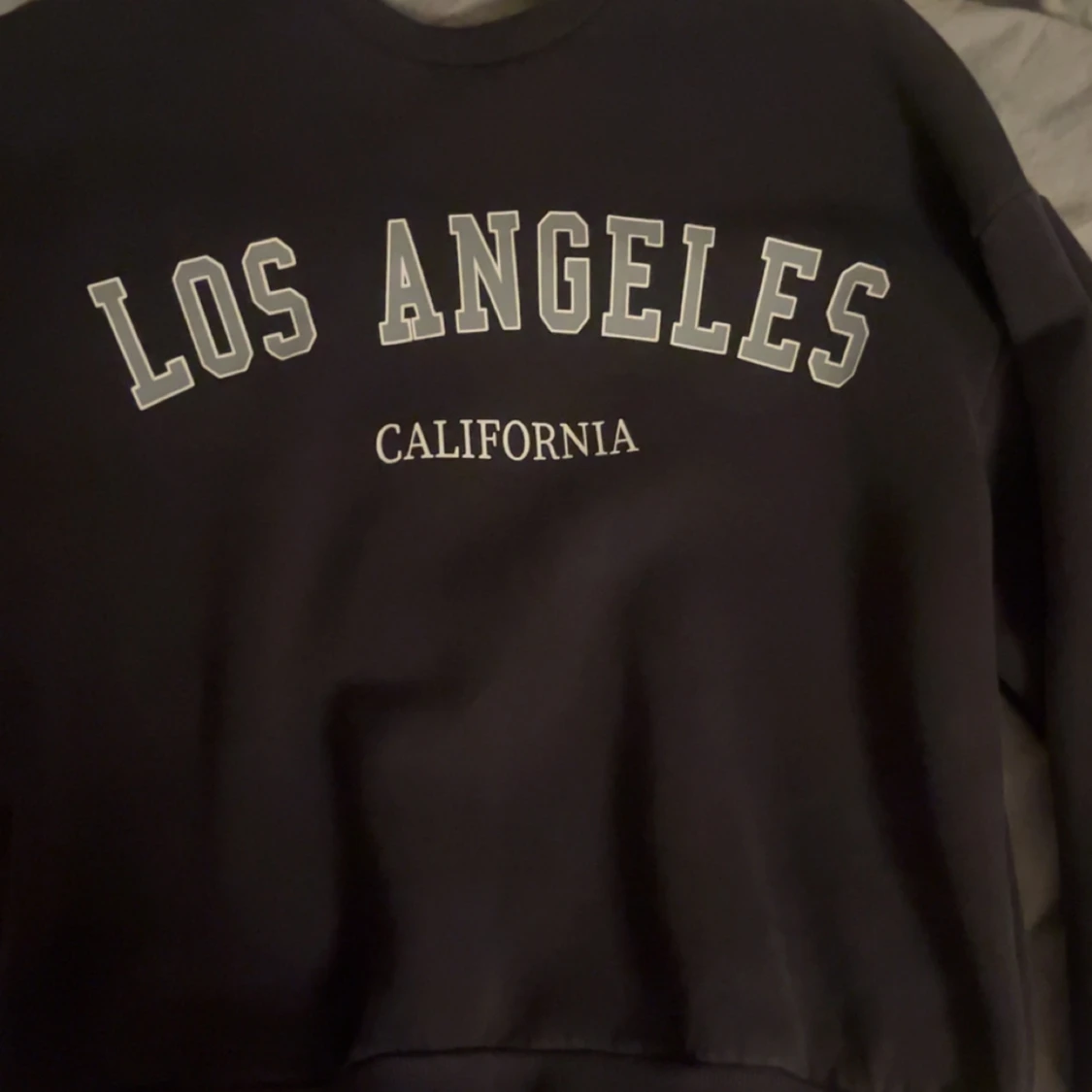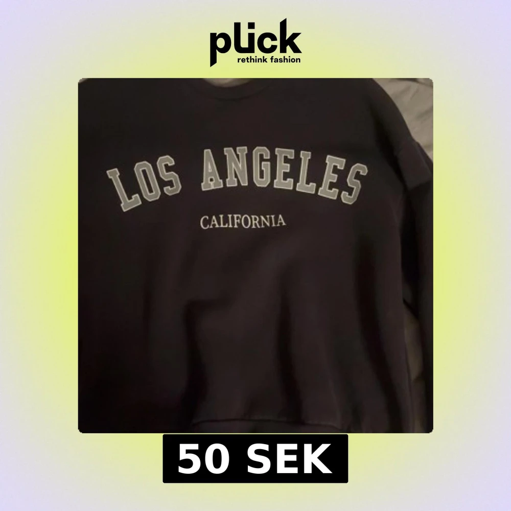 Säljer en svart sweatshirt från Gina Tricot med texten 'Los Angeles California' tryckt på framsidan. Tröjan har en klassisk rund hals och långa ärmar. Perfekt för en avslappnad stil.