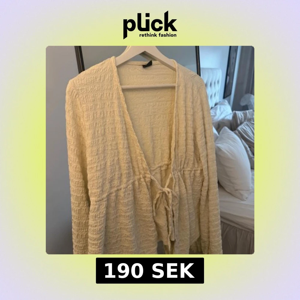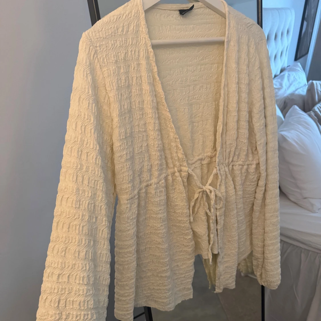 Superfin beige omlottkofta från Gina Tricot i storlek M. Koftan har ett ribbat, strukturerat tyg och knytband framtill. Långärmad och med djup v-ringning, perfekt att slänga på över en topp. Snyggt flowy material som känns mjukt mot huden.