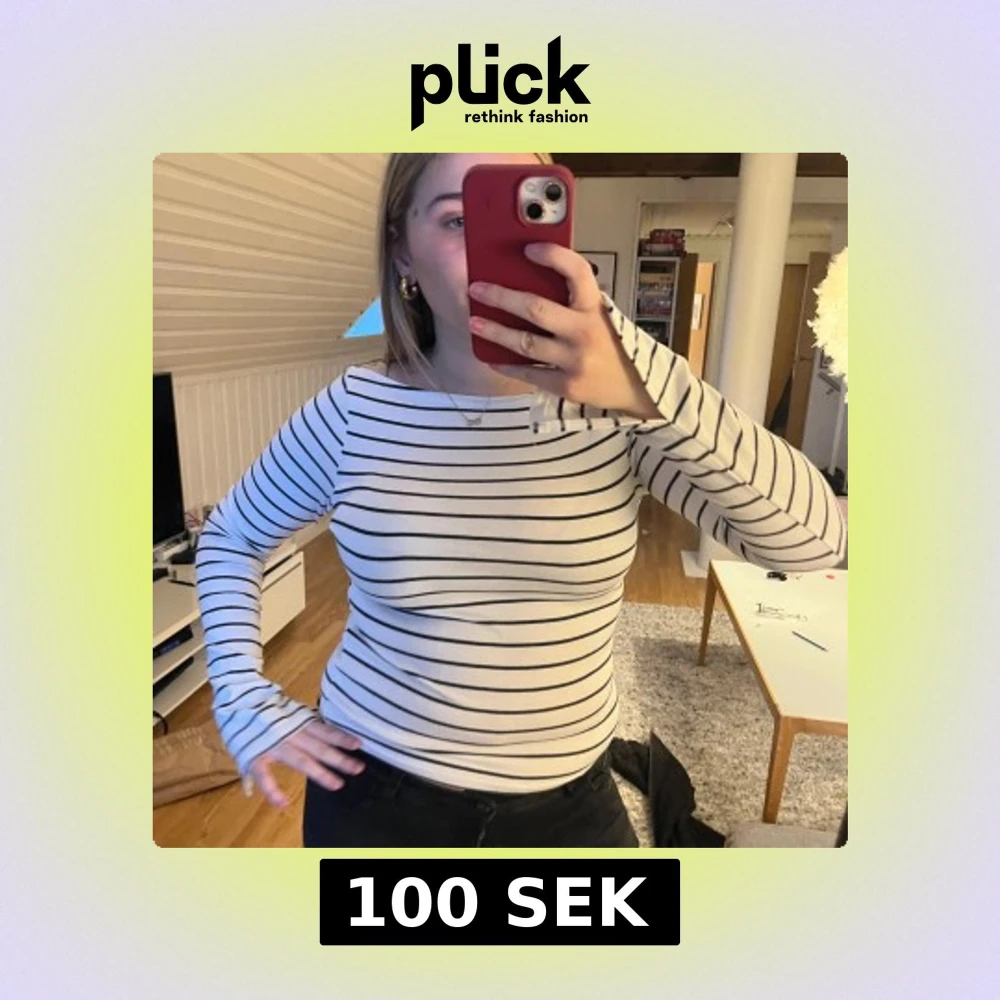 Säljer en stilren vit och svart randig långärmad topp. Perfekt för en avslappnad look. Toppen har en klassisk design med smala ränder och en bekväm passform.