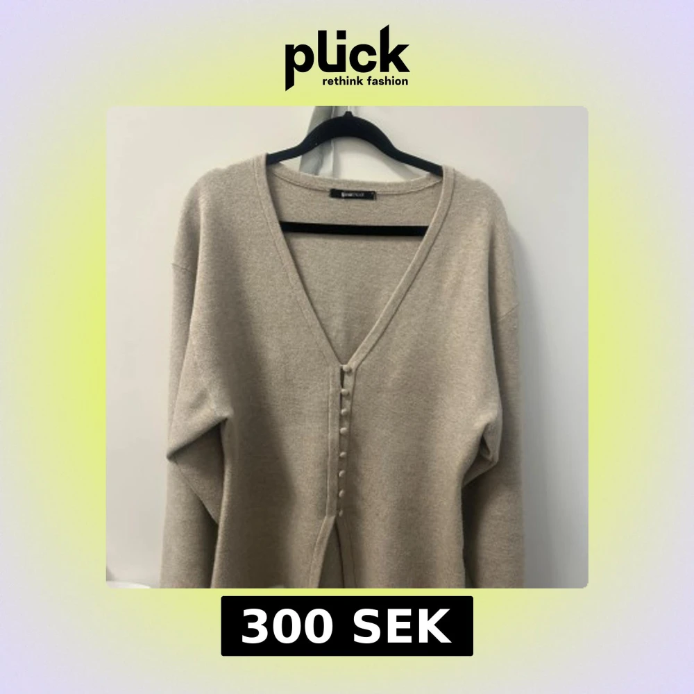 Snygg beige kofta från Gina Tricot med djup v-ringning och dekorativa knappar framtill. Koftan har lång ärm och är i mjukt material som känns skönt mot huden. Perfekt att slänga på sig när det är lite kyligare ute. Detta är en väldigt populär tröja som ofta är slutsåld. Den är i storlek M och är använd ett fåtal gånger.