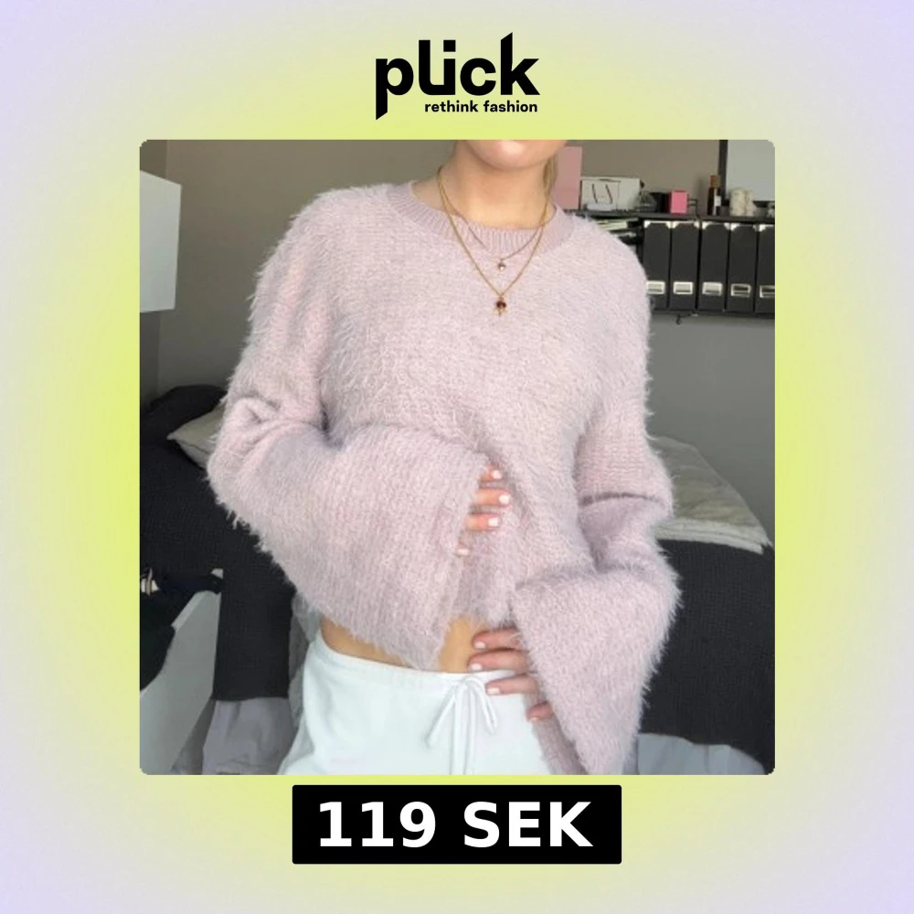Supermysig ljusrosa stickad tröja med fluffig yta och breda, långa ärmar. Tröjan har en croppad passform och rund halsringning. Perfekt för dig som gillar en chill och cozy vibe.
