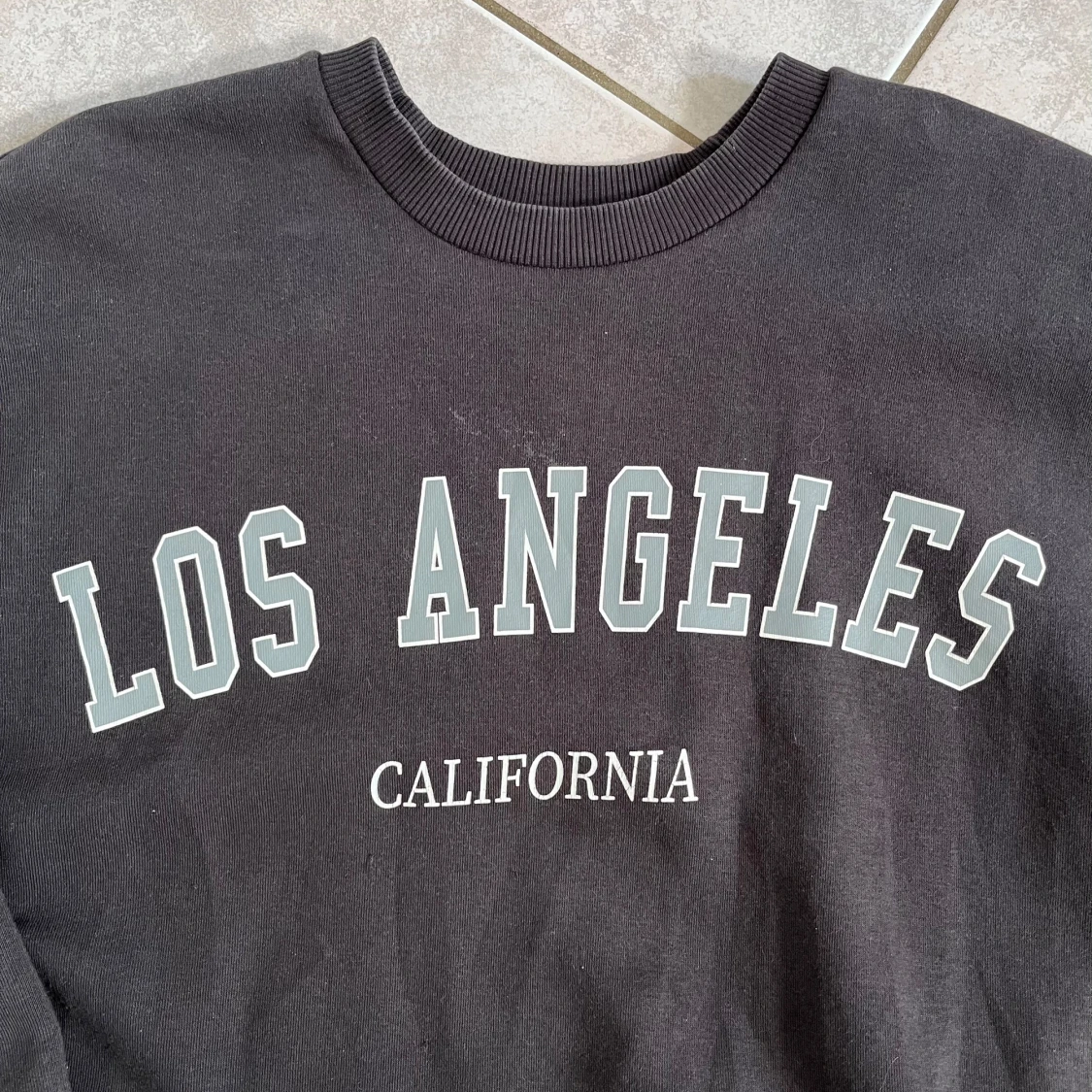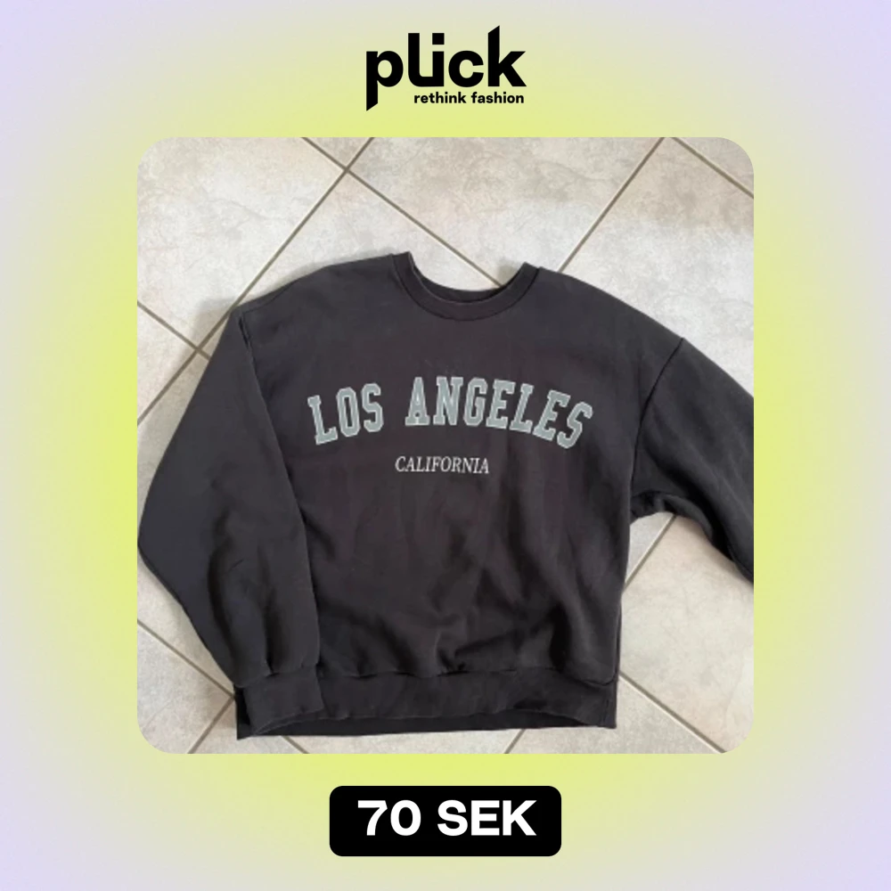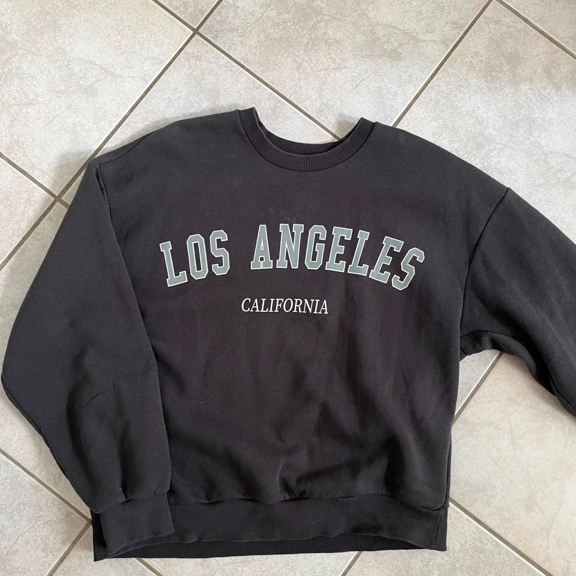 Säljer en svart sweatshirt från Gina Tricot med texten 'Los Angeles California' tryckt på framsidan. Tröjan är i storlek M och har en normal passform. Perfekt för en avslappnad stil eller som ett mysigt lager under kalla dagar. skriv vid frågor💗