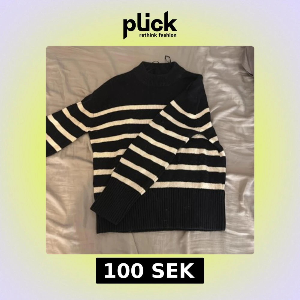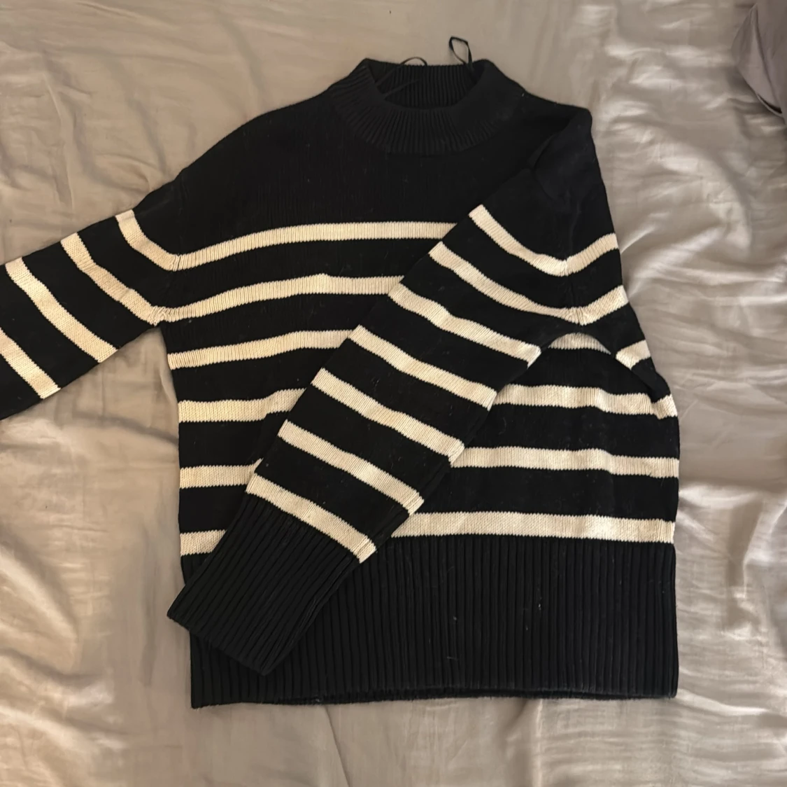 Säljer en svart och vit randig stickad tröja med hög hals och breda ribbade muddar. Tröjan har en loose passform och långa ärmar, perfekt för kyliga dagar. Klassisk och stilren design som funkar till många outfits.