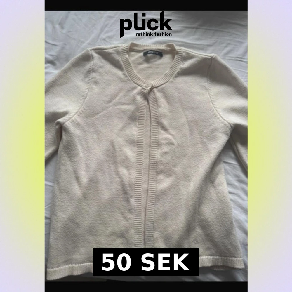 Snygg beige kofta från Gina Tricot med rund halsringning och ribbade kanter. Koftan har en enkel knapp framtill och är långärmad. Perfekt att slänga över en t-shirt eller linne för en chill look. Tröjan är i fint skick men kan upplevas nopprig.