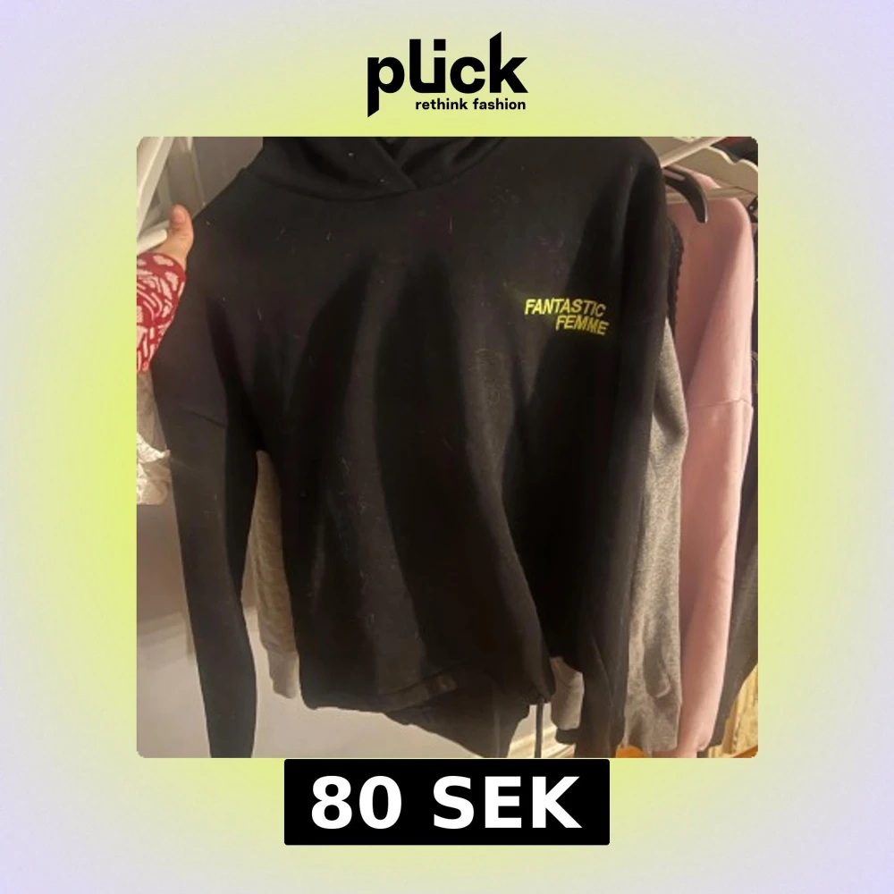 Säljer en svart hoodie med texten 'FANTASTIC FEMME' i gult på bröstet. Den har en klassisk huva och långa ärmar, perfekt för en avslappnad stil. Finns även ett snöre längst ner på hoodien om man vill korta ner den eller något. Knappt använd