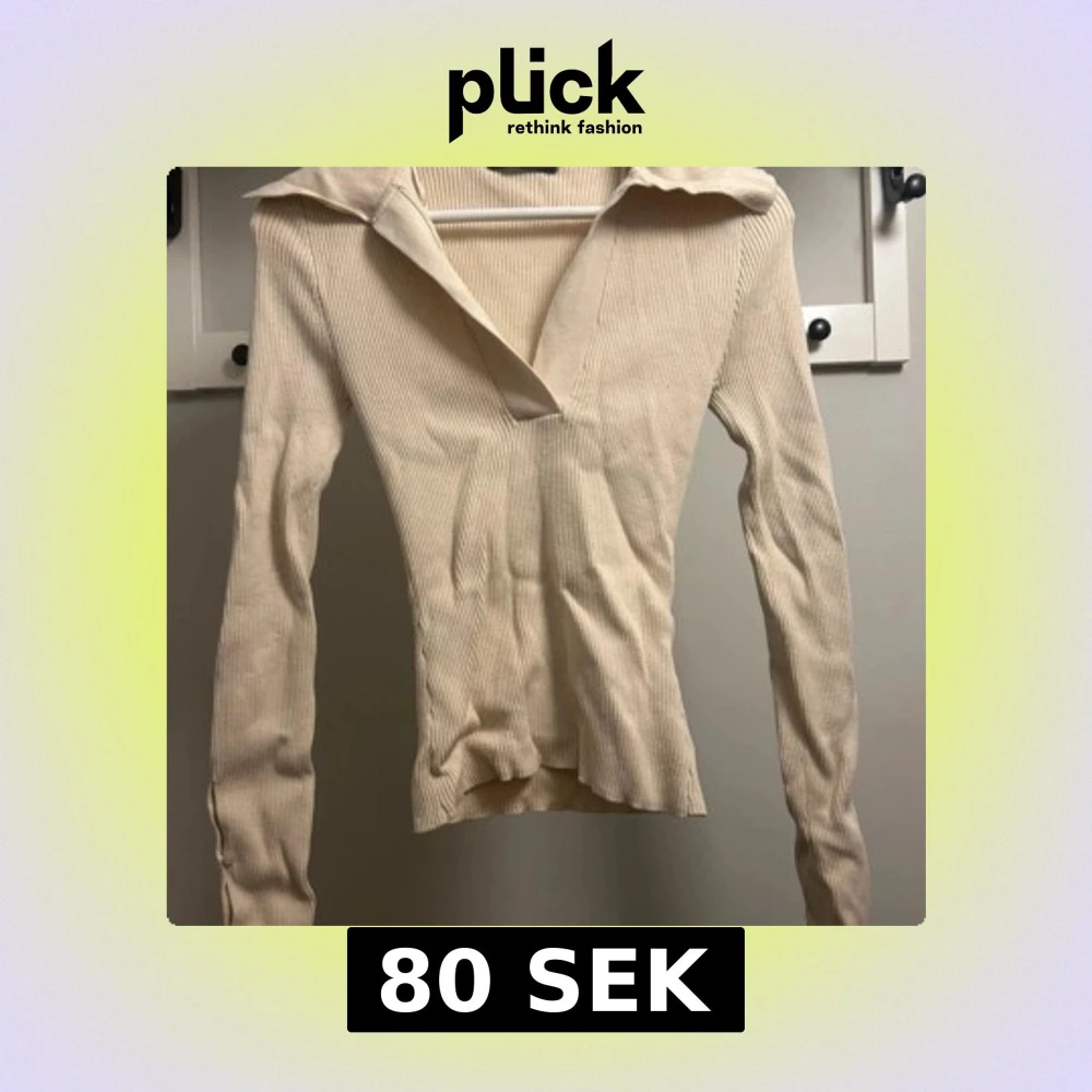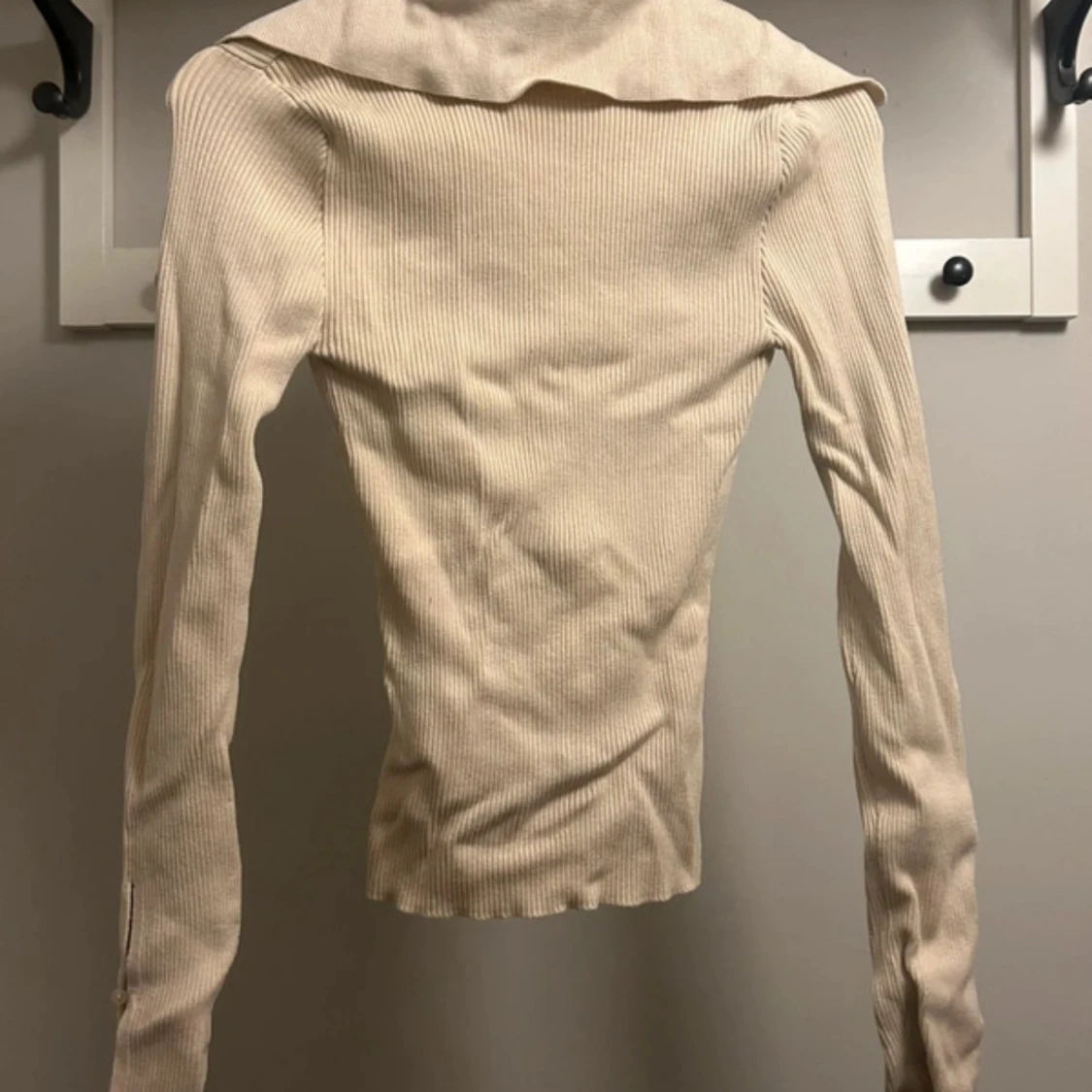 Säljer en stilren beige ribbad tröja med krage och v-ringning. Tröjan har långa ärmar och en figurnära passform. Perfekt för en chic och avslappnad look.