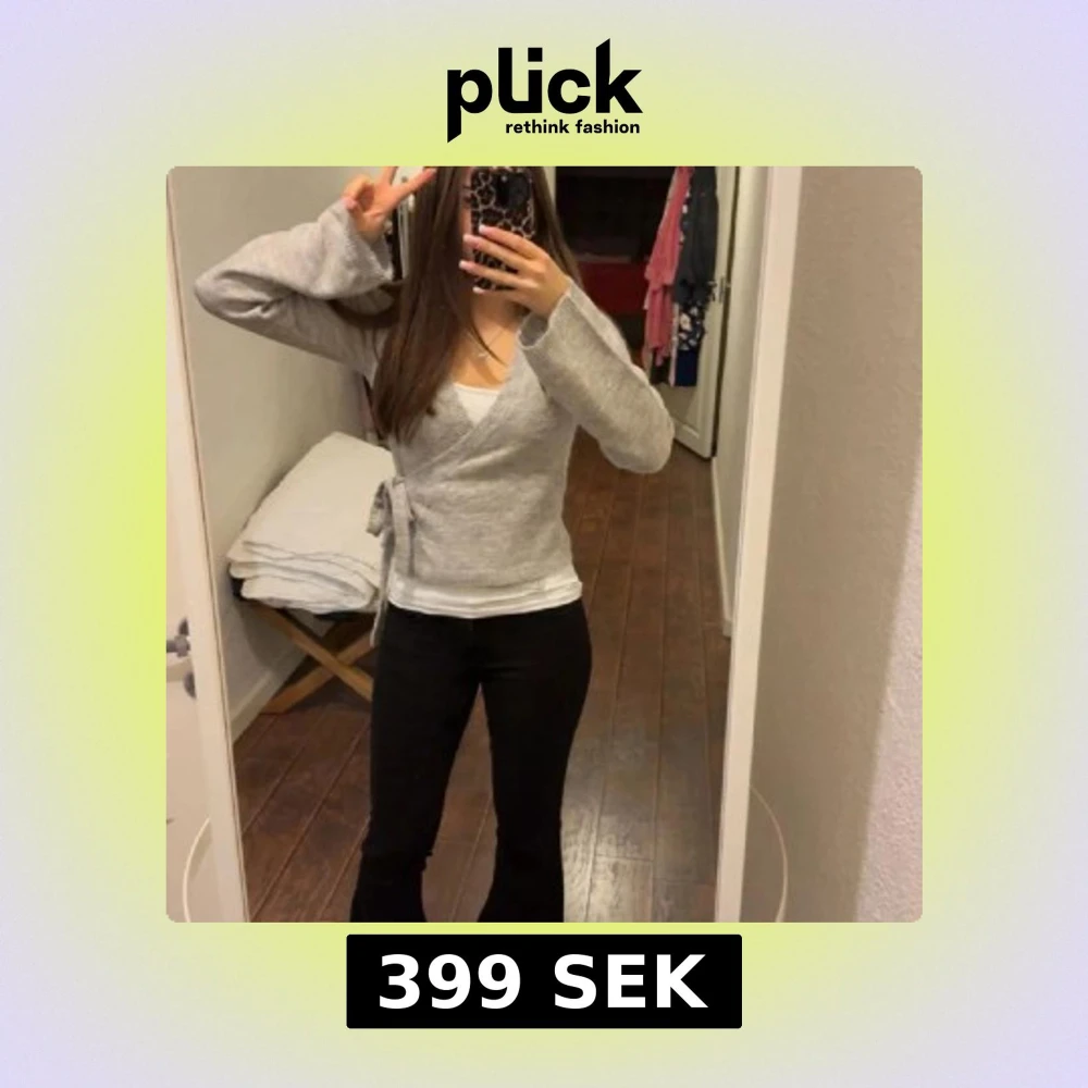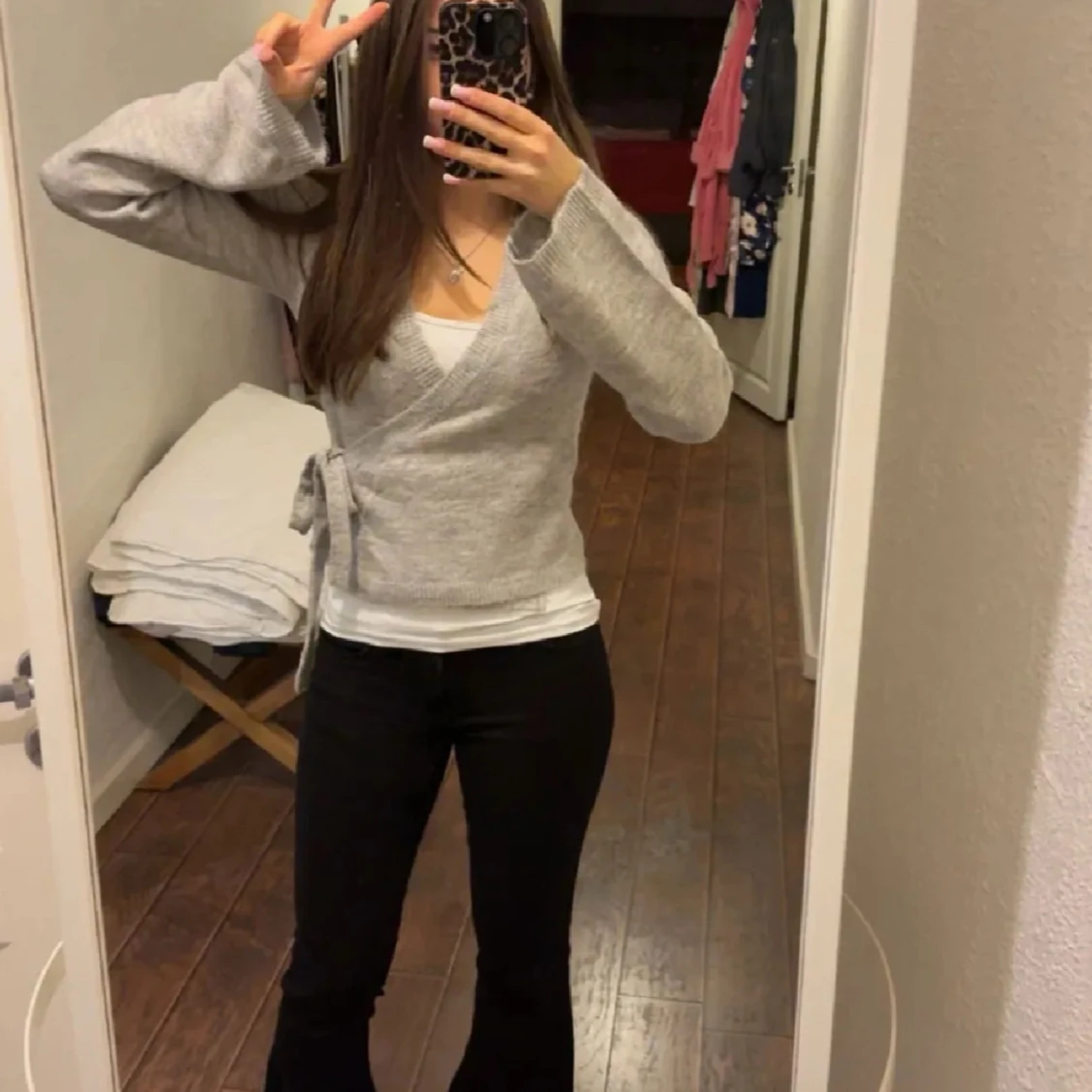 Supermysig ljusgrå omlottkofta med knytband i sidan och v-ringad hals. Koftan har långa ärmar och är stickad i ett mjukt material, perfekt för lager-på-lager. Enkel att matcha med både jeans och kjol.
