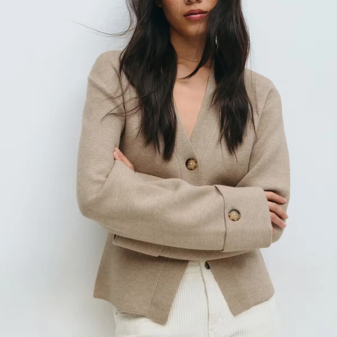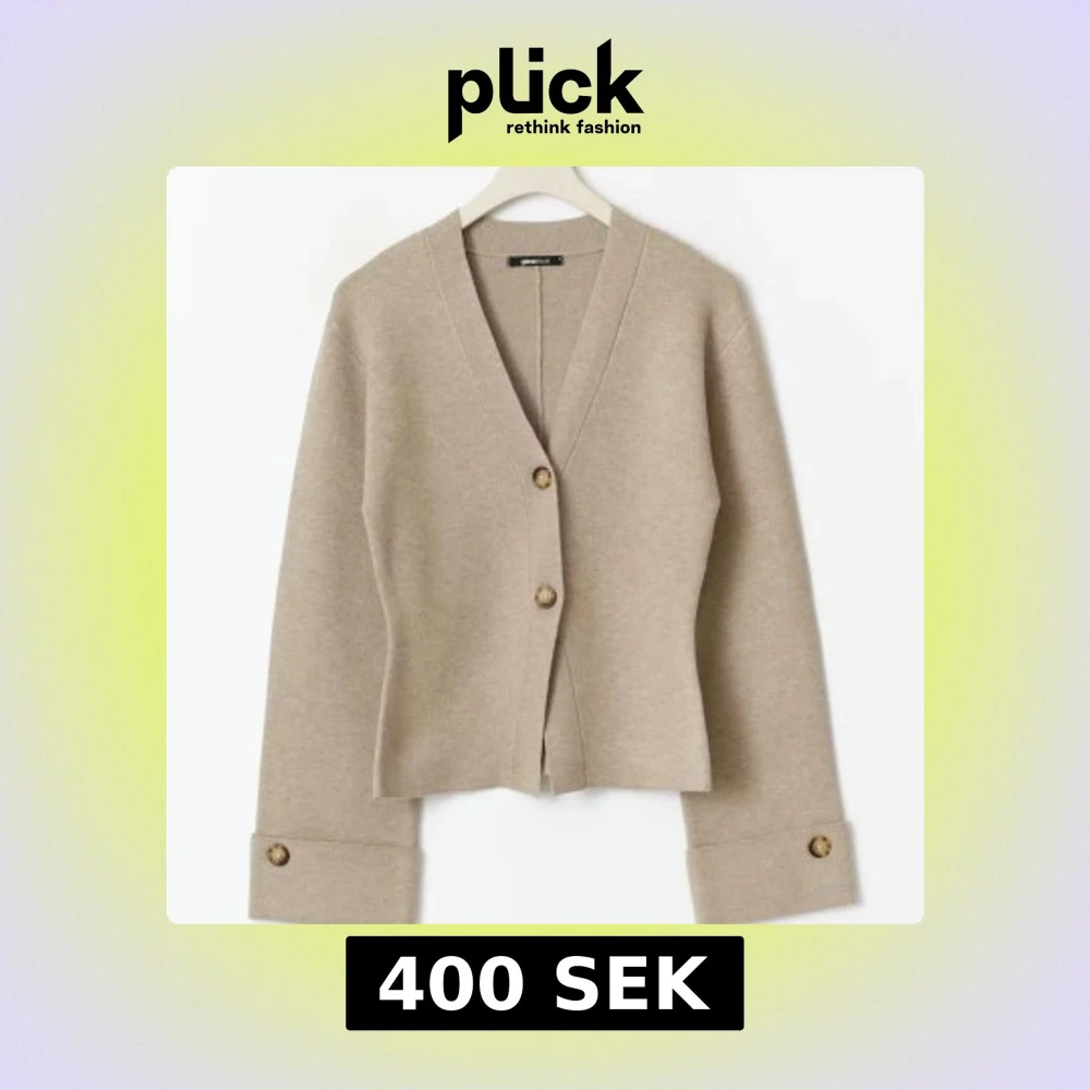 Snygg beige kofta från Gina Tricot med v-ringad hals och två stora knappar framtill. Helt ny aldrig använd. Fick i present och hade inget kvitto