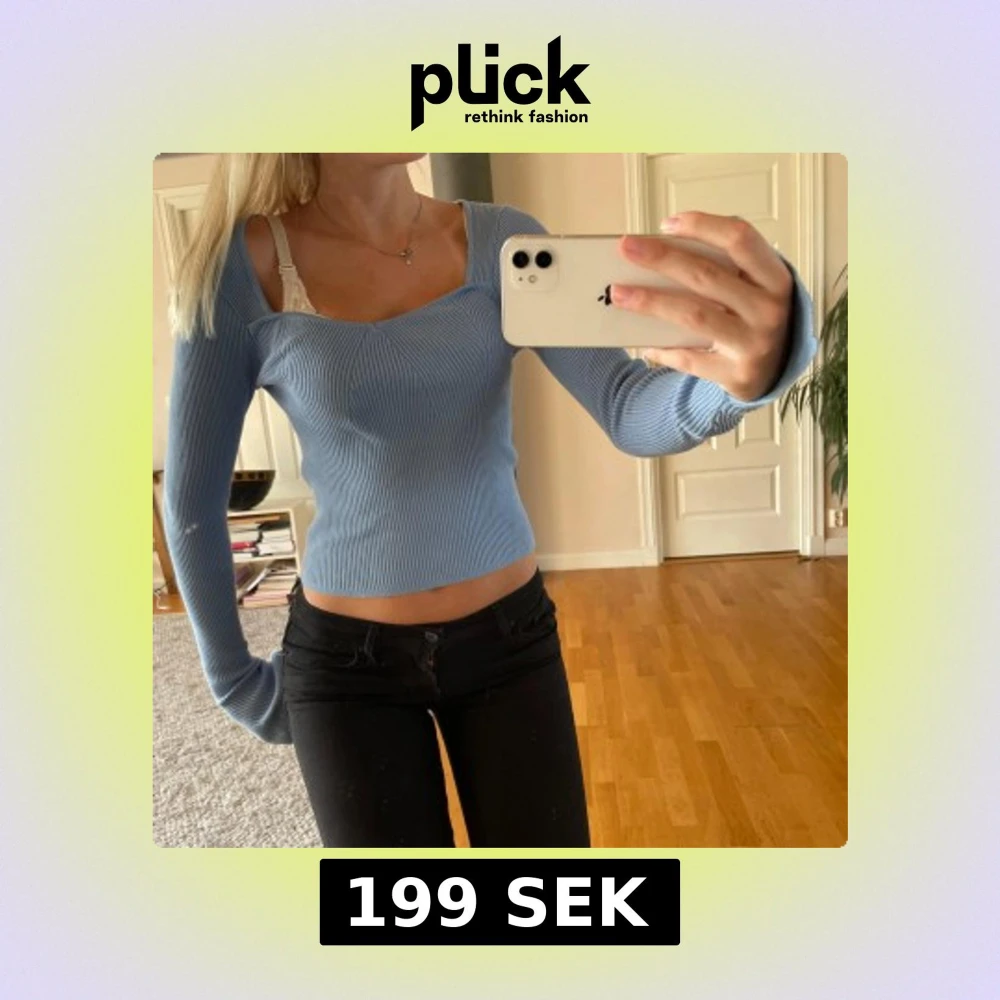 Säljer en ljusblå ribbad stickad tröja med lång ärm och snygg fyrkantig ringning. Tröjan är figurnära och har en croppad passform som sitter tajt och markerar midjan. Perfekt att styla med höga jeans för en clean look.