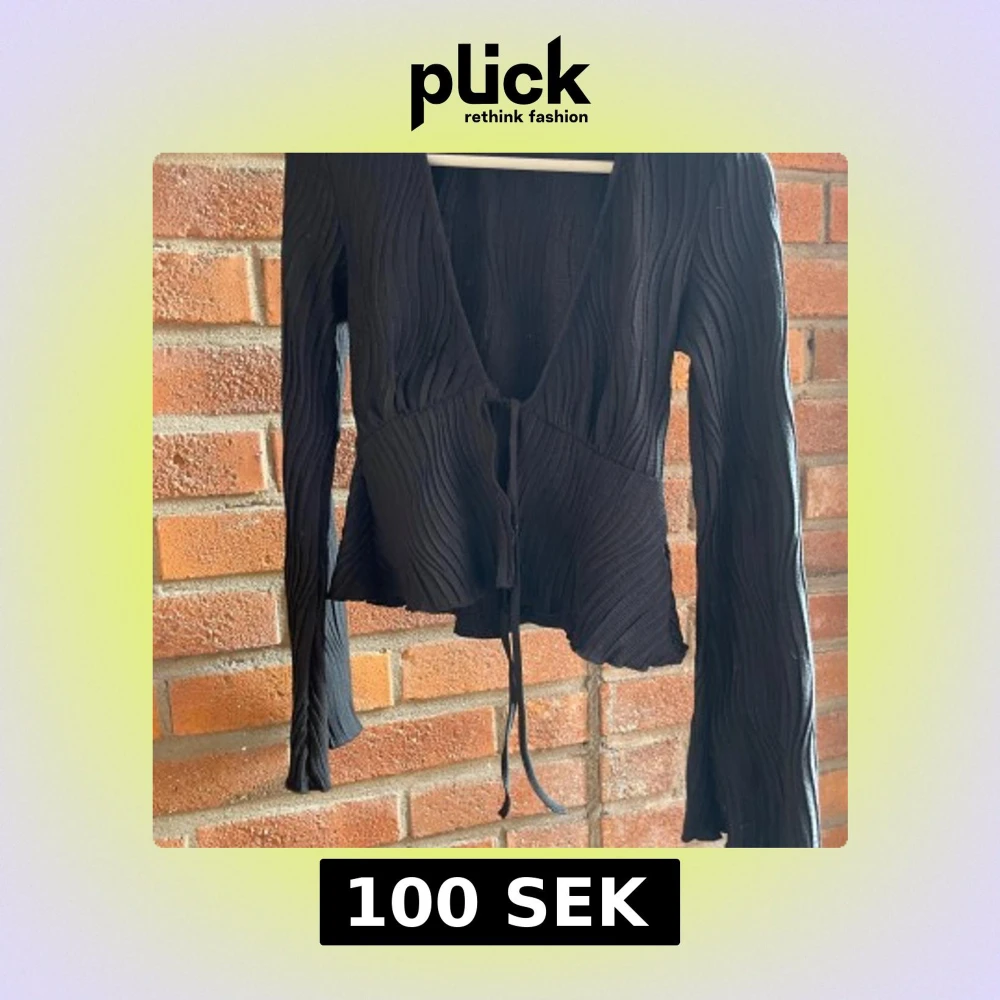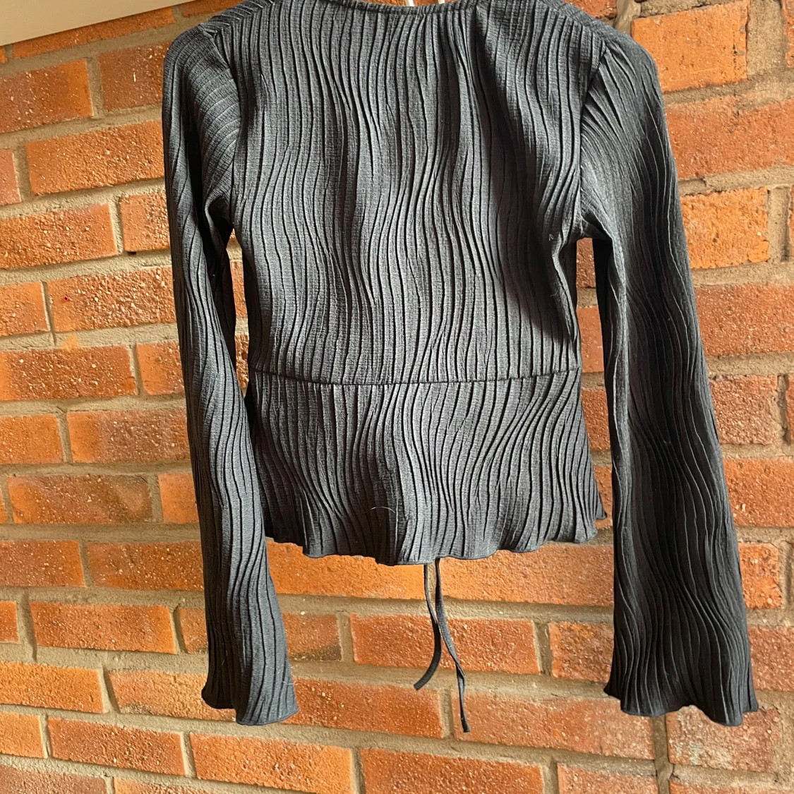 Svart omlottkofta från Gina Tricot i storlek S. Tröjan har ribbad struktur, långa ärmar och knytband framtill. Den har en lätt croppad passform och är tillverkad i mjukt syntetmaterial. Perfekt för dig som gillar stilrena och trendiga plagg.