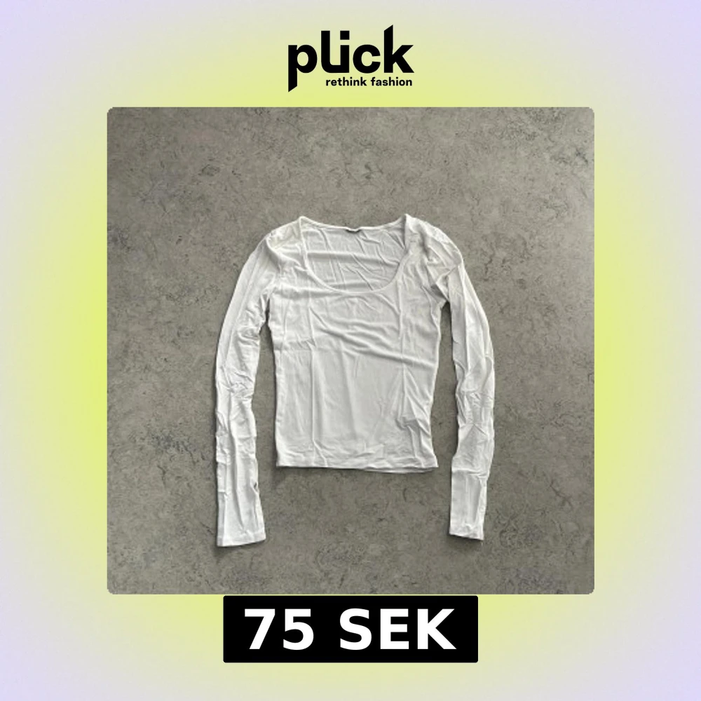 En basic vit långärmad topp med rundad, lite djupare urringning. Tunt och mjukt material som känns skönt mot huden. Perfekt att styla med jeans eller kjol för en clean look. Slit på båda ärmarna så de går över handen, men inte sitter åt. Har klippt bort lappen, men tröjan är storlek S från Gina tricot. Inga defekter, endast tvättad.
