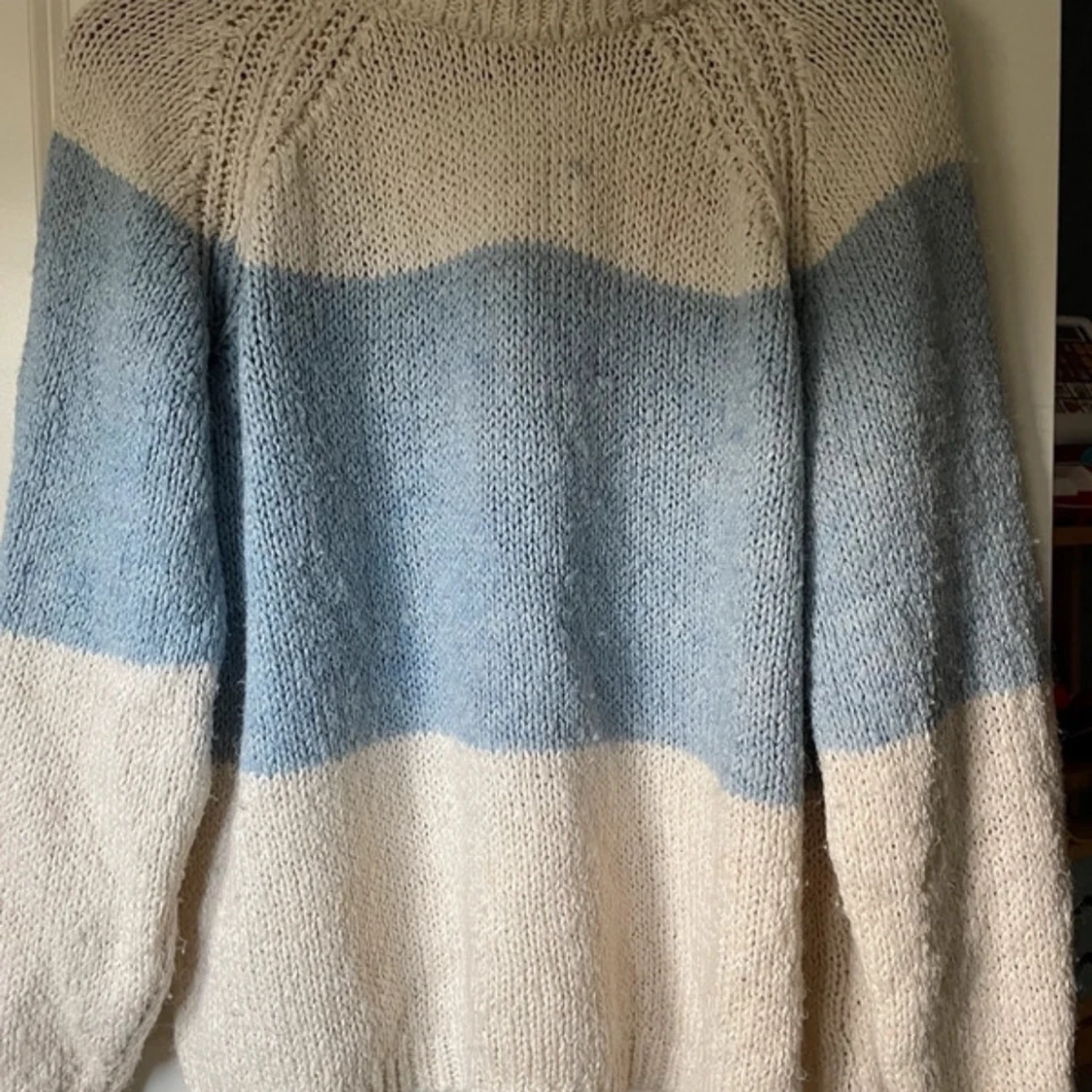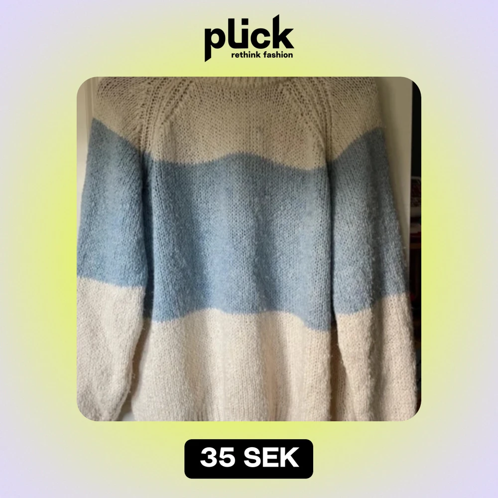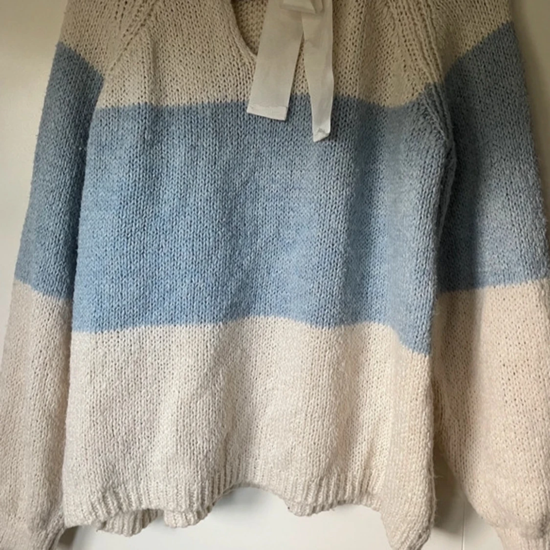 Mysig stickad tröja med breda ränder i ljusblått och vitt. Perfekt för kyliga dagar med sin avslappnade passform och långa ärmar. Tröjan har en enkel design som gör den lätt att matcha med olika outfits. Perfekt för både höst och vinter!