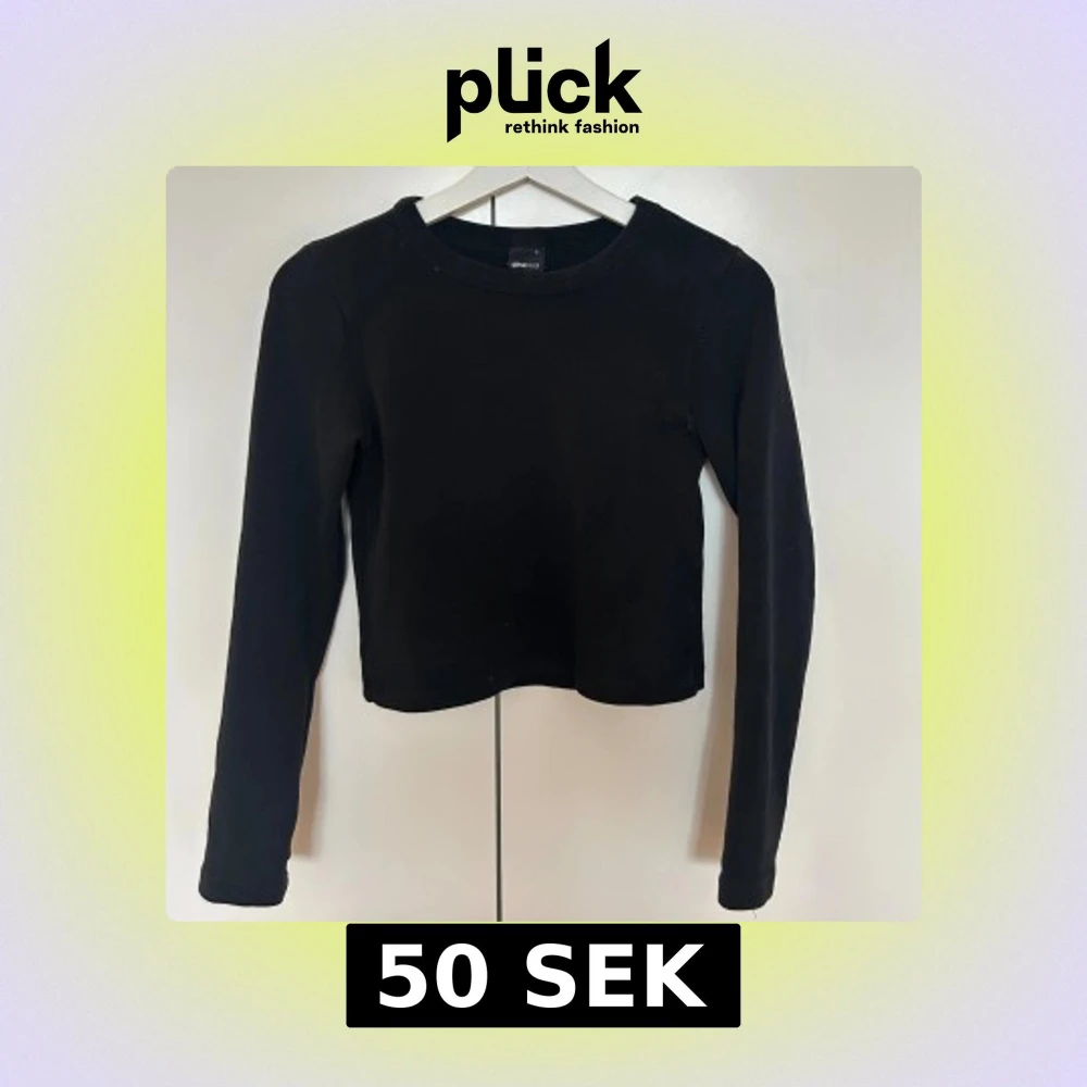 En basic svart långärmad tröja från Gina Tricot i storlek S. Tröjan har rund halsringning och en rak, något croppad passform.
