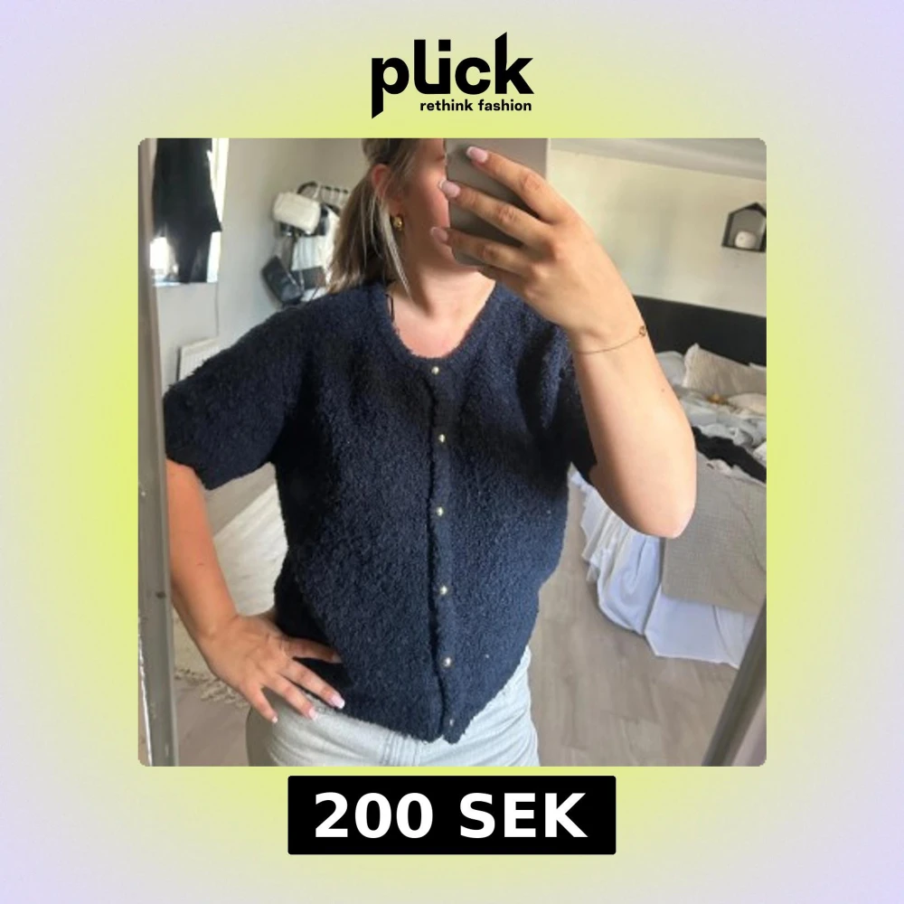 Säljer en fluffig mörkblå kofta med korta ärmar och pärlknappar framtill. Perfekt att slänga på sig över ett linne eller t-shirt. Koftan har en mjuk och mysig känsla och passar till många olika outfits.