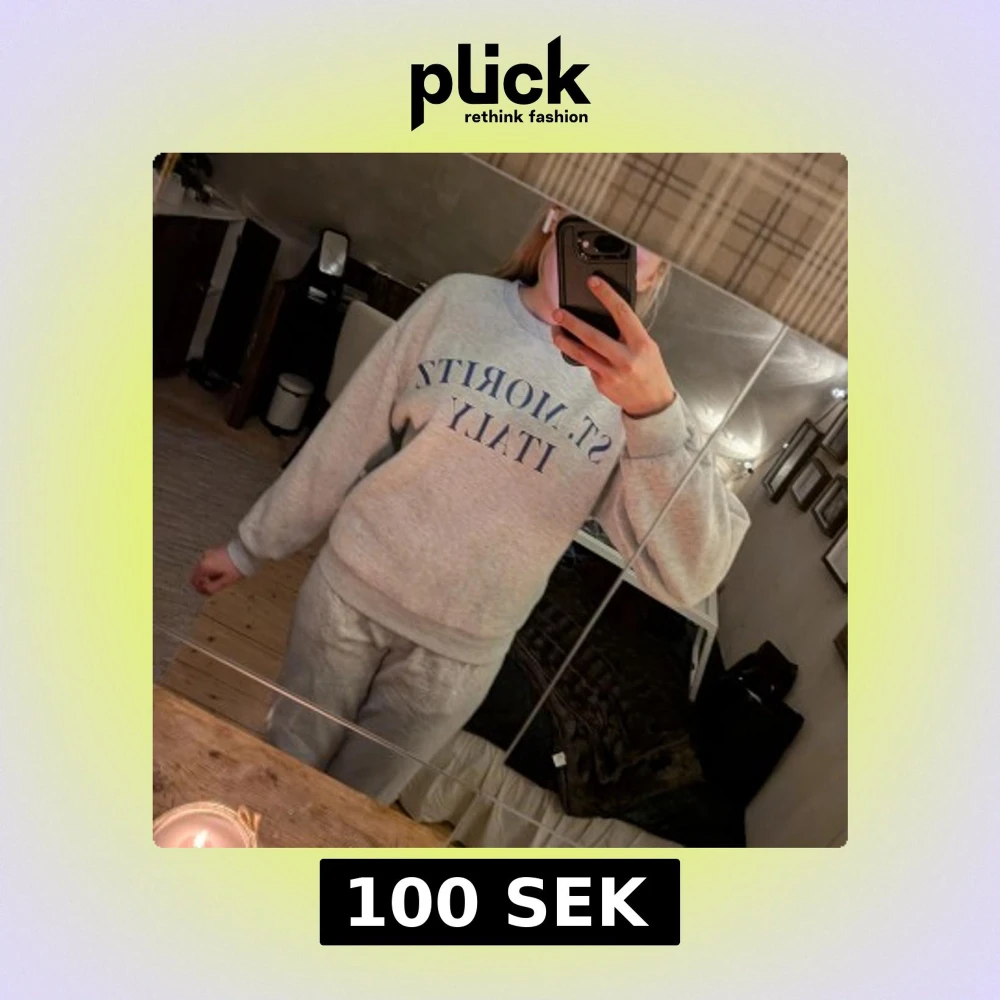 Grå sweatshirt från Gina Tricot med blå text 'ST. MORITZ ITALY' framtill. Klassisk rund halsringning, ribbade muddar i storlek S. I bra sick