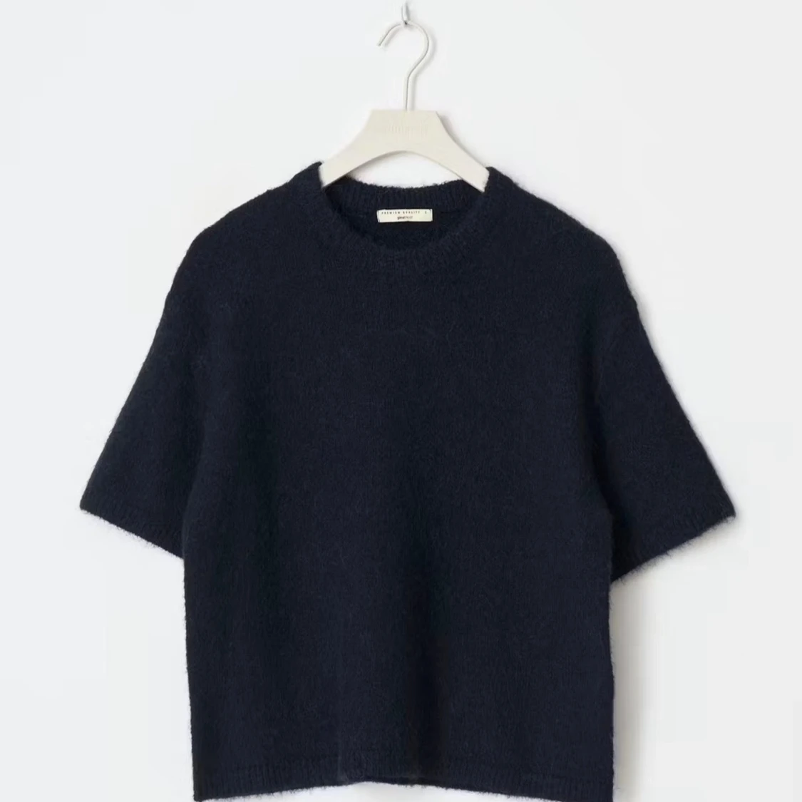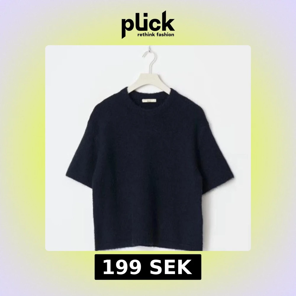 Säljer en stilren mörkblå stickad tröja från Filippa K. Tröjan har korta ärmar, rund halsringning och en boxig, lite loose passform. Perfekt att styla med jeans eller kjol för en clean look.