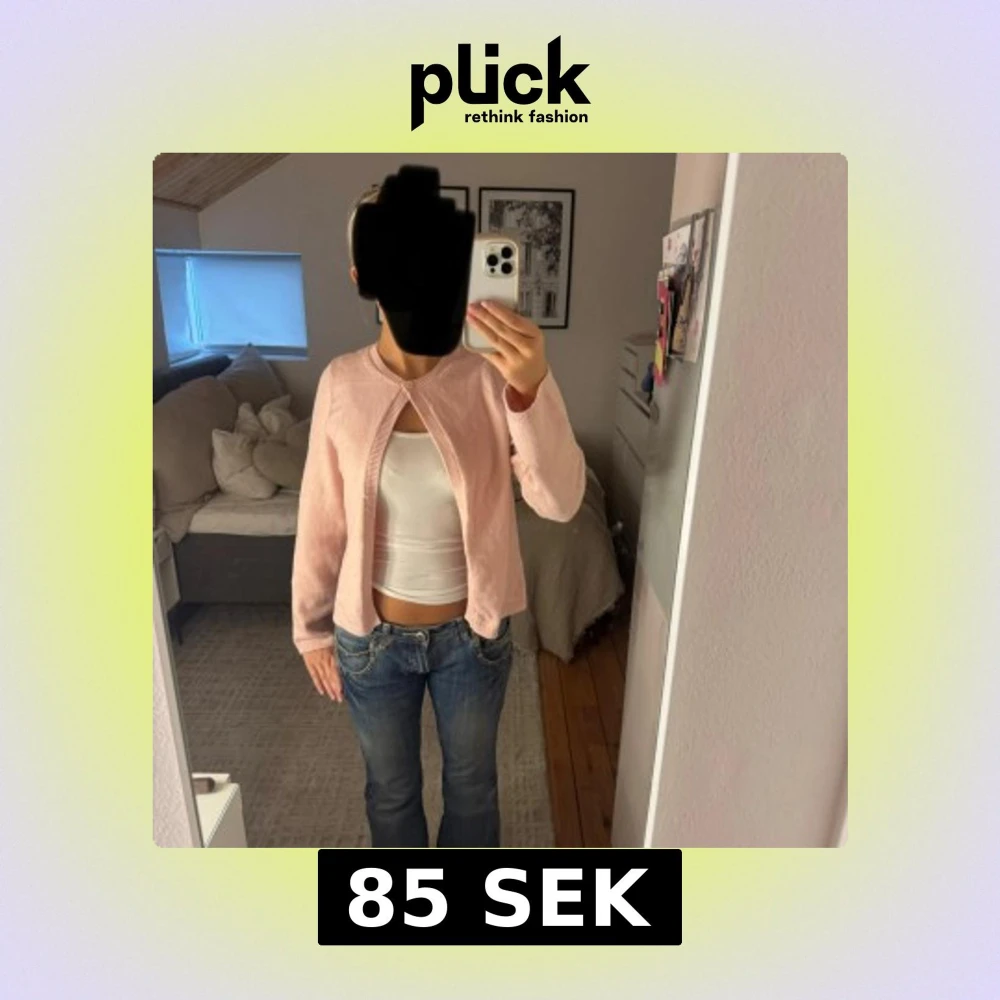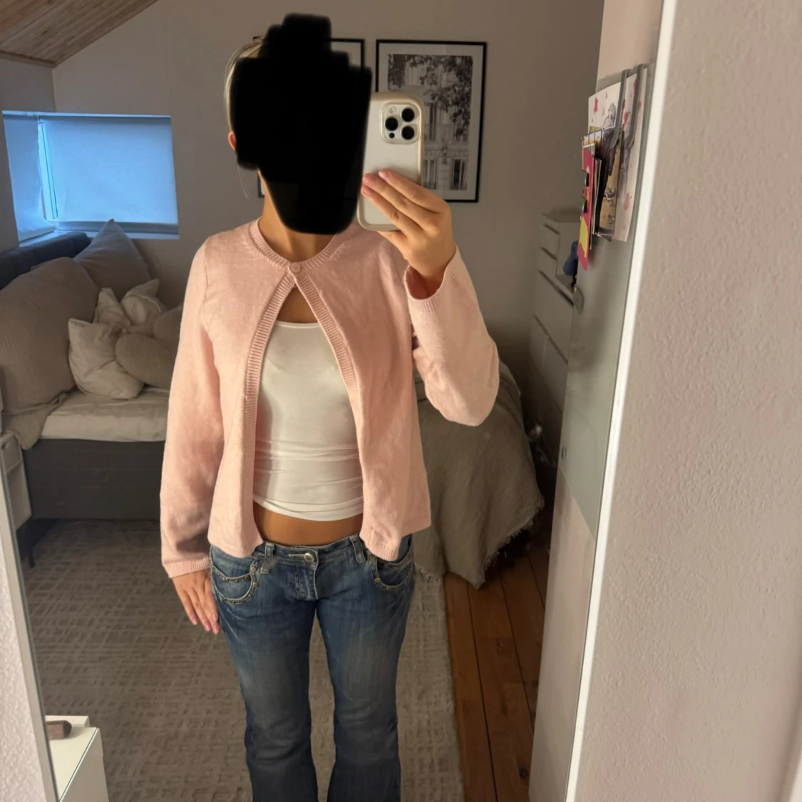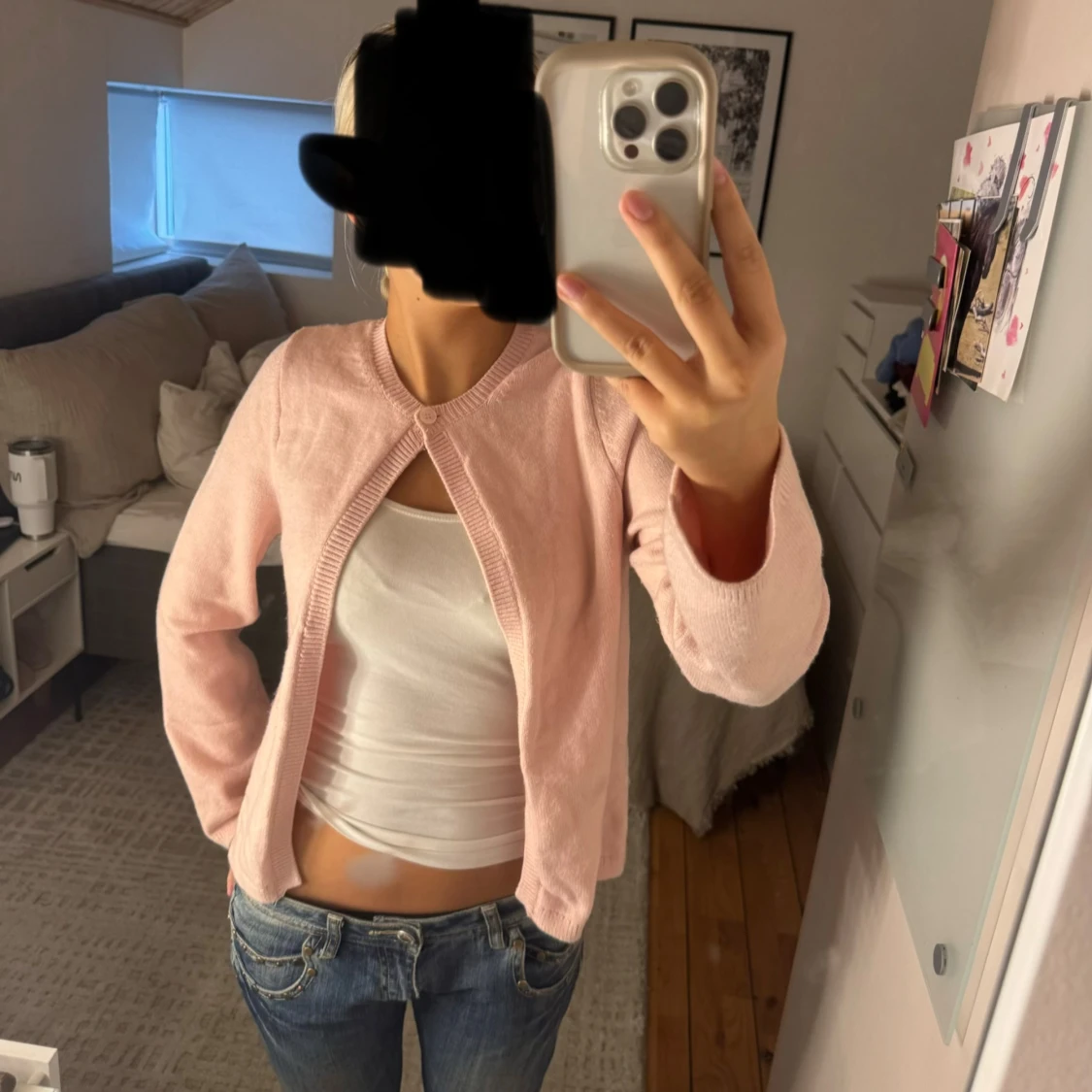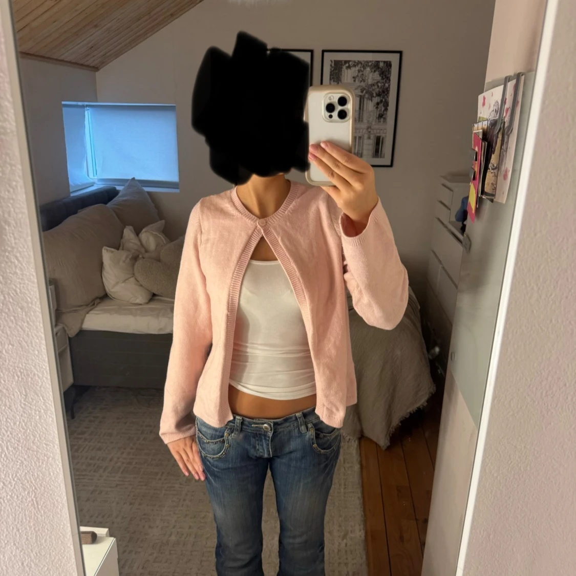 Söt ljusrosa kofta med en enkel knapp framtill. Koftan har långärmade ärmar och är tillverkad i ett mjukt stickat material. Storlek S.