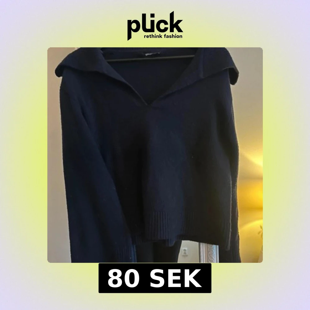Säljer en svart stickad tröja med v-ringning och bred krage. Tröjan har långa ärmar och ribbade muddar vid ärmslut och nederkant. Från Gina tricot i storlek S