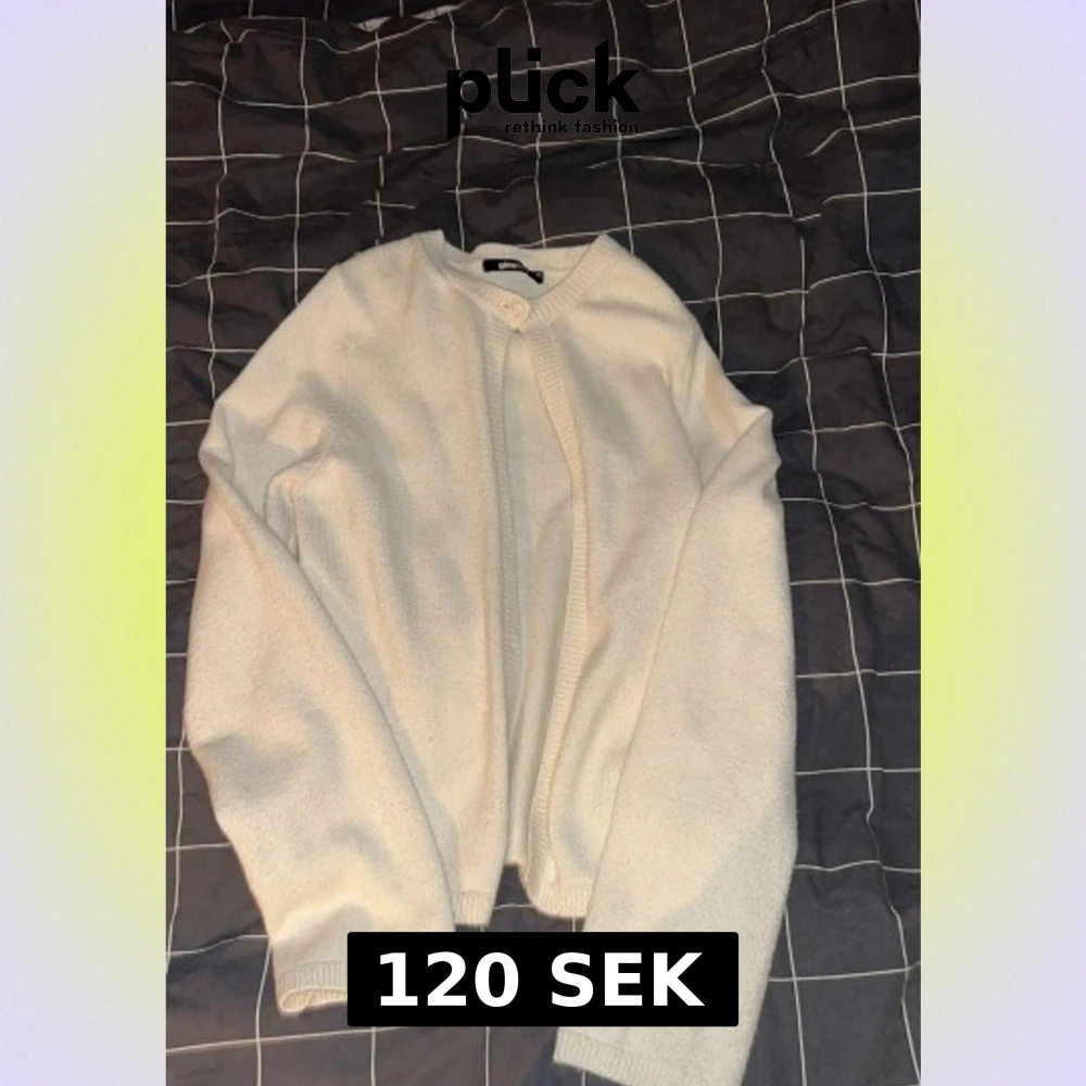 Mysig vit kofta från Gina Tricot med rund hals och en knapp framtill. Koftan har långärmade ärmar och är tillverkad i ett mjukt stickat material som känns skönt mot huden. Perfekt att slänga på sig när det är lite kyligt ute.