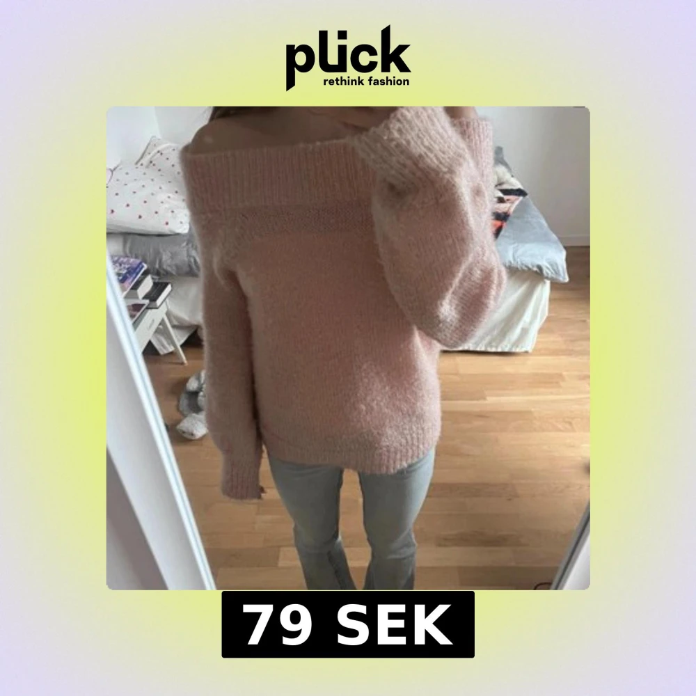 Ljusrosa stickad tröja med offshoulder-design och bred ribbad kant upptill. Tröjan har långärmade ärmar och är fluffig och mjuk i materialet. Passformen är lite större och oversized för att vara i storlek XS, så skulle även säga att den passar S och M. Den har defekter som små fläckar och är lite nopprig. Köpt på Vinted för 140 kr.