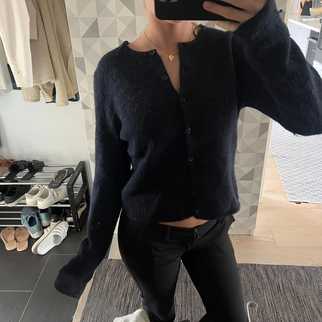 Snygg mörkblå kofta med rund hals och knappar framtill. Tröjan är lite croppad och har långa ärmar. Materialet känns mjukt och lite fluffigt, perfekt för kyliga dagar. Enkel och stilren design som passar till svarta jeans eller kjol.