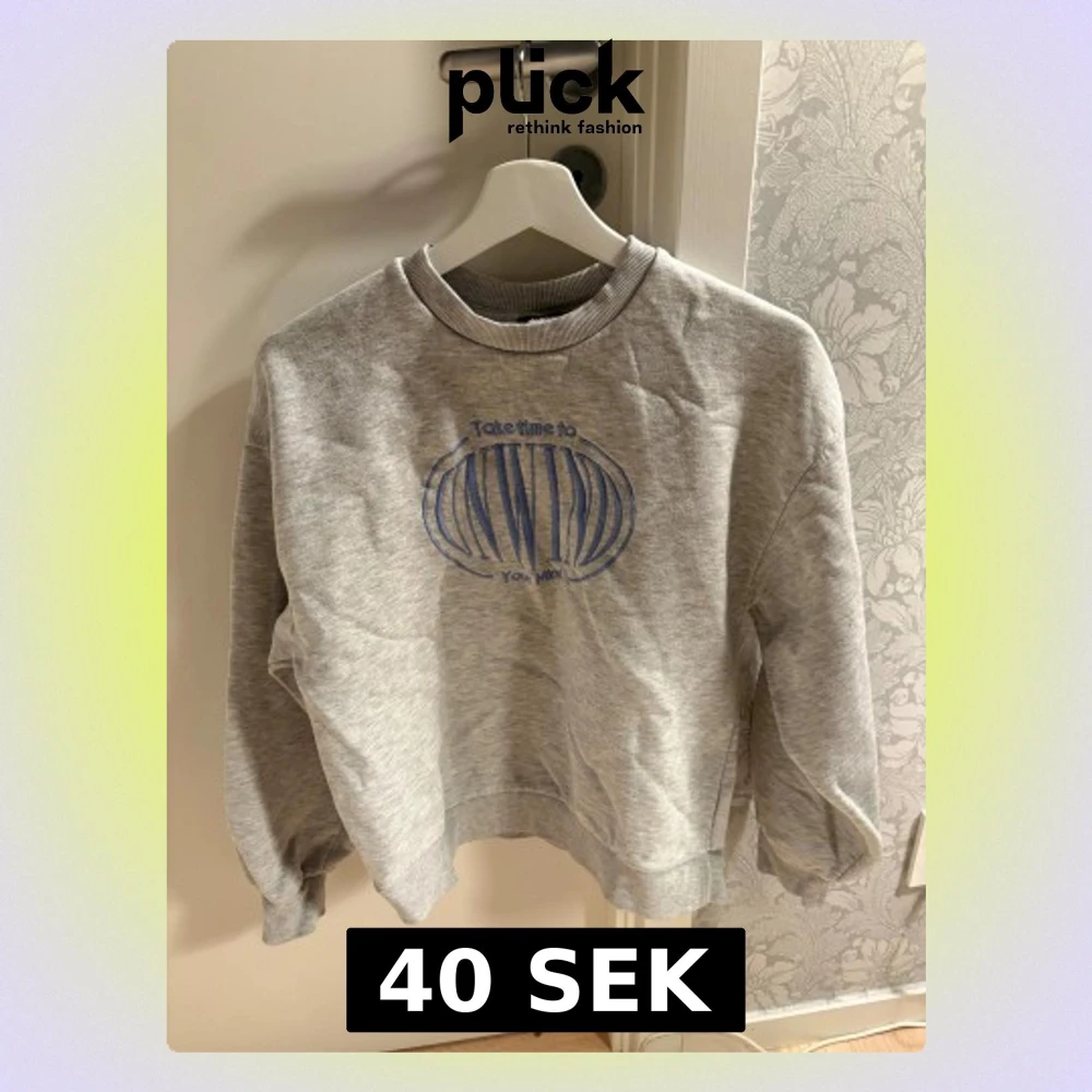 Grå sweatshirt från Gina Tricot i storlek S med blått tryck på bröstet där det står 'Take time to unwind your mind'. Tröjan har rund hals, ribbade muddar och är långärmad. Perfekt för chill dagar och enkel att matcha med jeans eller leggings.