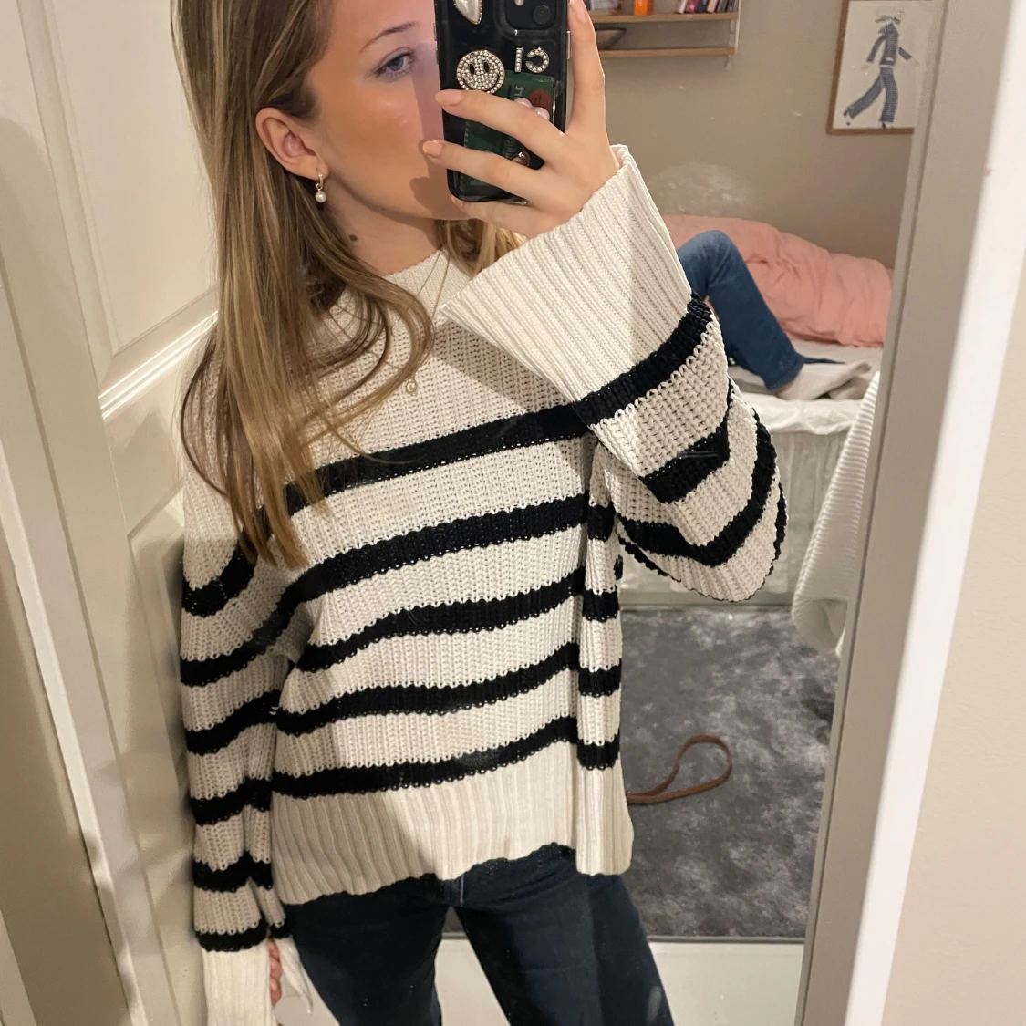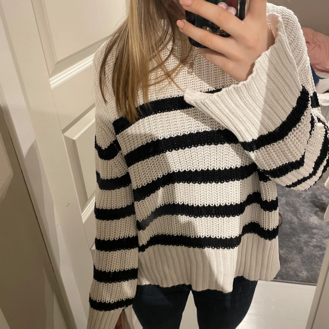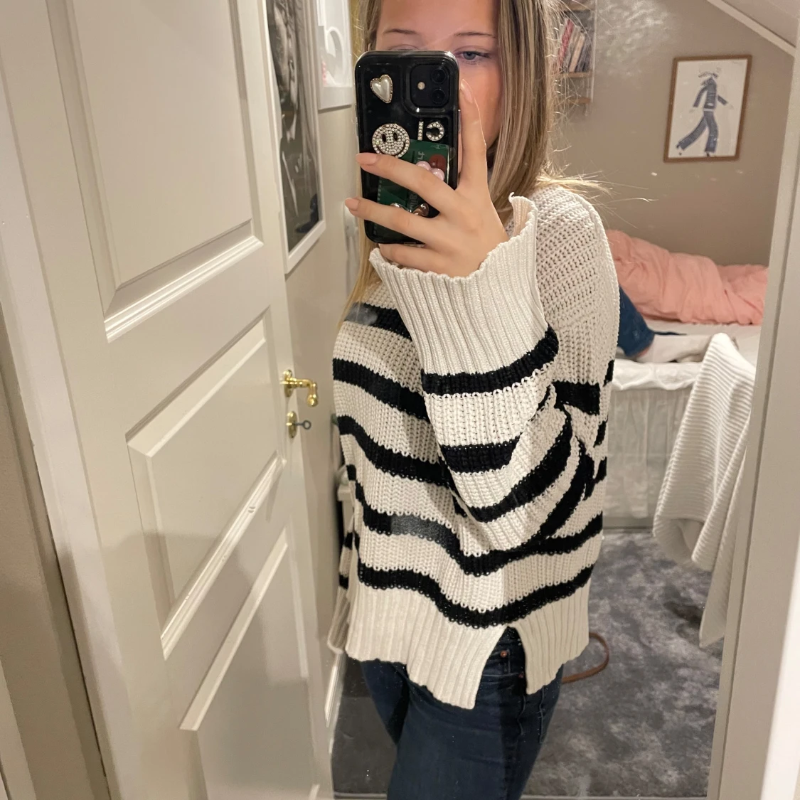 Säljer en mysig stickad tröja med svartvita ränder. Tröjan har långa ärmar och en avslappnad passform, skriv för fler bilder eller vid frågor! Priset kan diskuteras