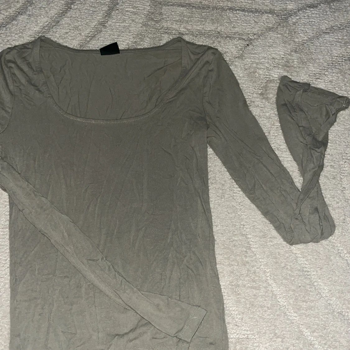 En enkel och stilren grå långärmad topp med rundad halsringning. Perfekt att styla med jeans eller kjol för en clean look. Tunn och mjuk i materialet, sitter skönt mot kroppen och passar året runt.