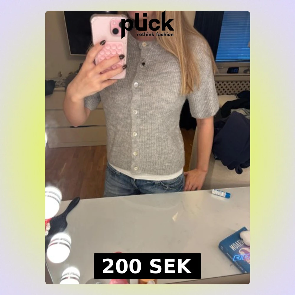 Säljer en grå stickad kofta från Gina Tricot i ullblandning. Koftan har korta ärmar, rund hals och knappar hela vägen framtill. Ribbad struktur som ger en mysig och chill vibe. Perfekt att slänga på över en t-shirt eller linne.