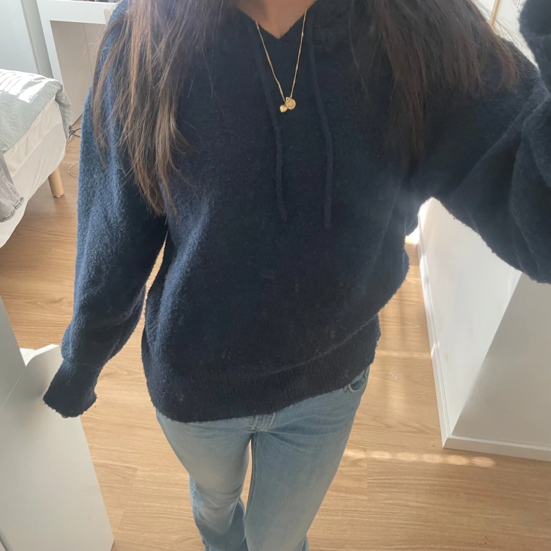 stickad mörkblå hoodie.💙 hoodien är varm och har långa ärmar samt ribbade muddar vid ärmslut och nederkant. 😇Perfekt för en avslappnad stil.🥰