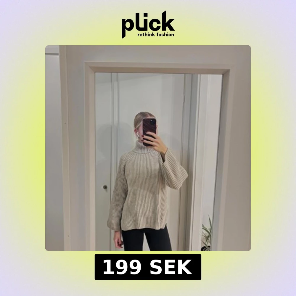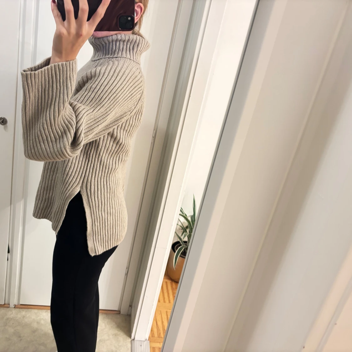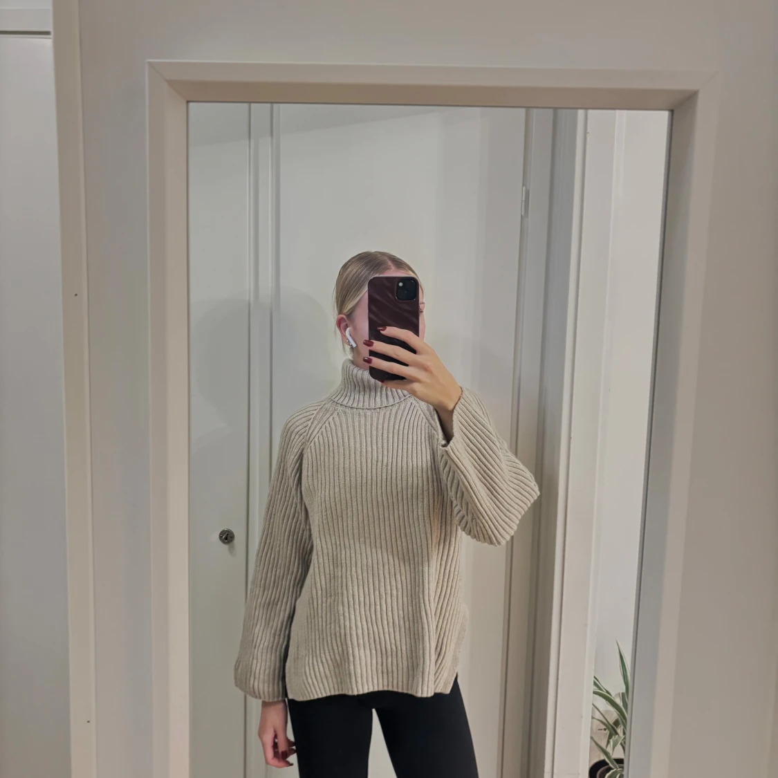 Säljer en beige ribbstickad polotröja med hög krage och slitsar i sidorna.