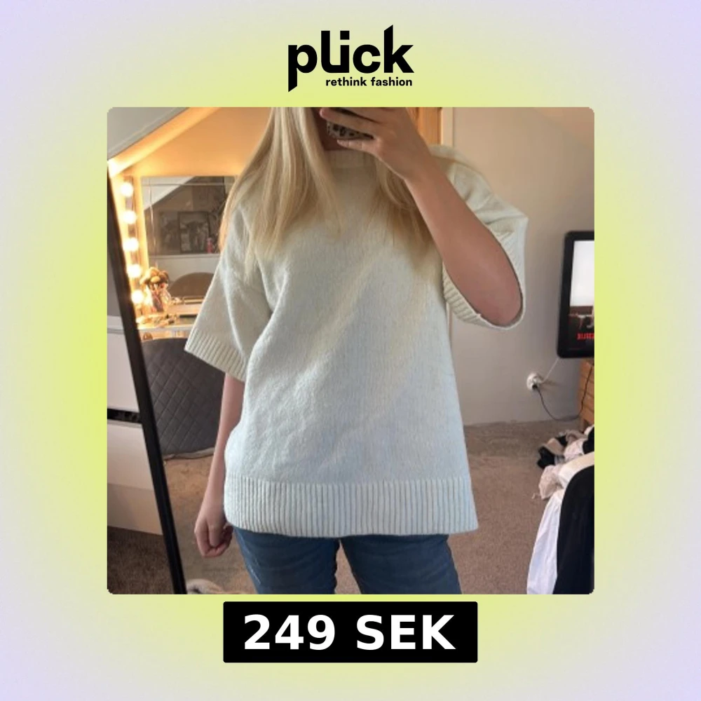Supermysig ljusvit stickad tröja med bred ribbad kant nertill och vid ärmslut. Tröjan har en loose passform och korta ärmar, perfekt för lager-på-lager. Enkel och stilren design som funkar till jeans eller kjol.