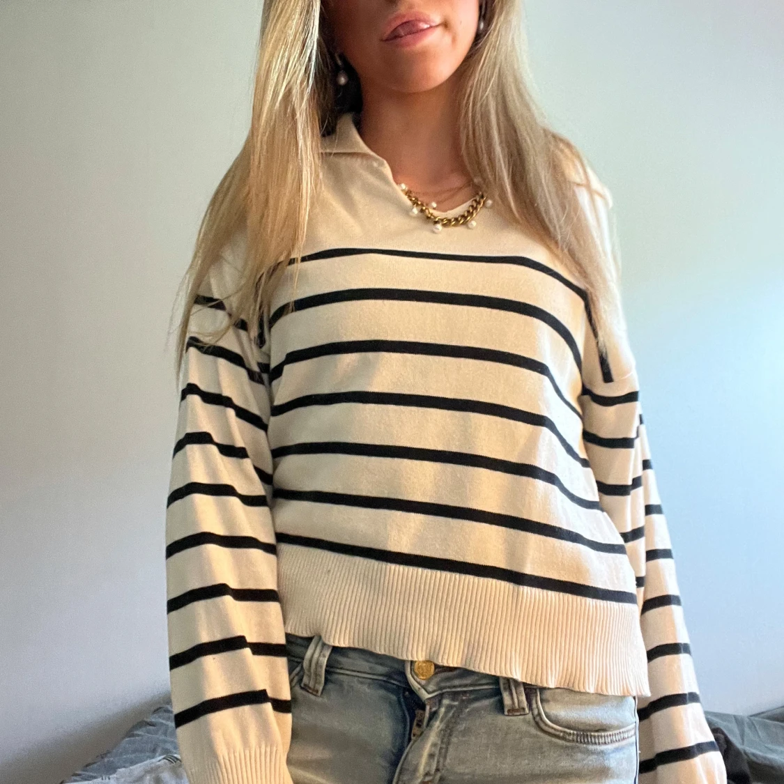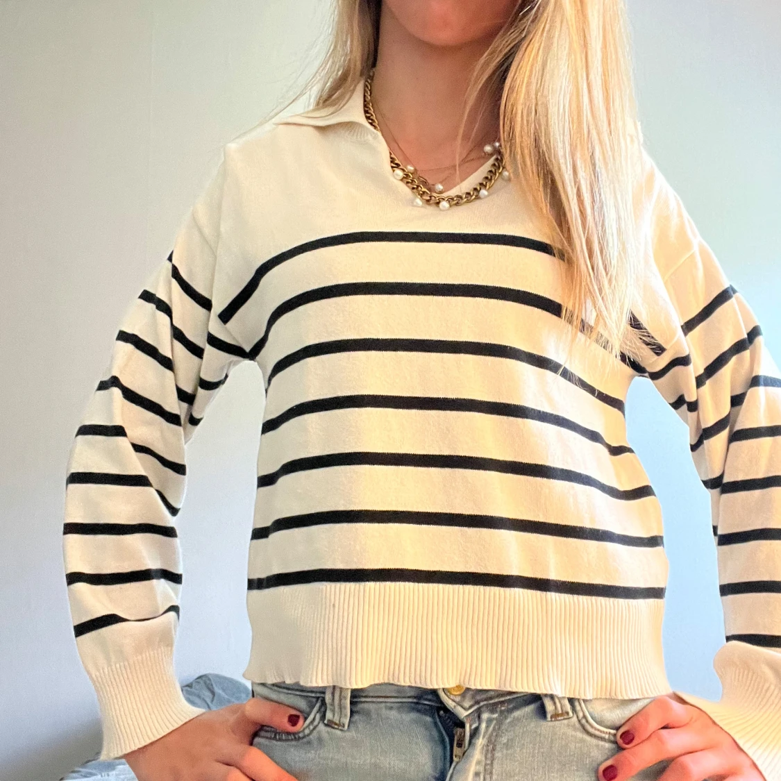 Snygg vit tröja med svarta horisontella ränder och en liten krage. Tröjan har lång ärm och ribbade muddar vid ärmslut och nederkant. Perfekt till jeans.