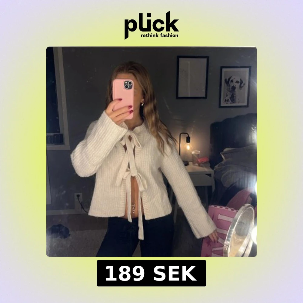Säljer en superfin vit ribbad kofta med två stora knytband framtill. Koftan har långärmade ärmar och är lite croppad i modellen, vilket ger en trendig look. Perfekt att styla med jeans eller kjol för en chill vibe.
