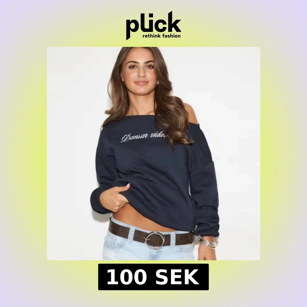 Mörkblå tröja med offshoulder och vit ”Dansar vidare i livet” text framtill. Tröjan har lång ärm och en lös passform. Den är superfin men kommer inte till användning längre 🤍