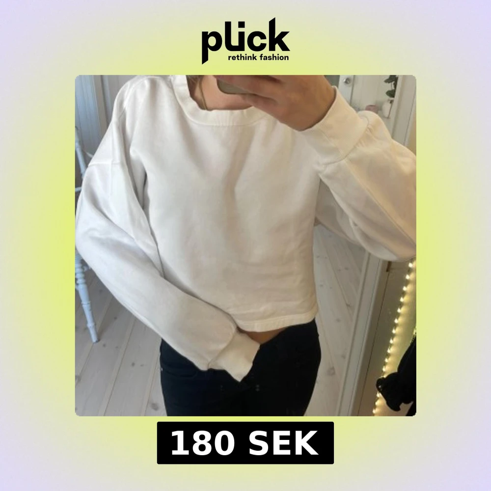 Säljer en vit croppad tröja från Gina Tricot. Det är en liten fläck på vänster arm men inget som syns när man har på sig den💓