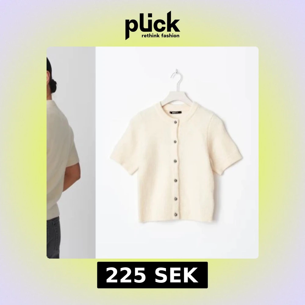 Säljer en stilren beige kofta från gina med korta ärmar och knappar framtill. Perfekt för lager-på-lager och ger en mjuk och elegant look. Passar bra till både jeans och kjol.