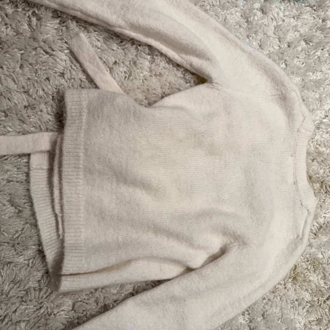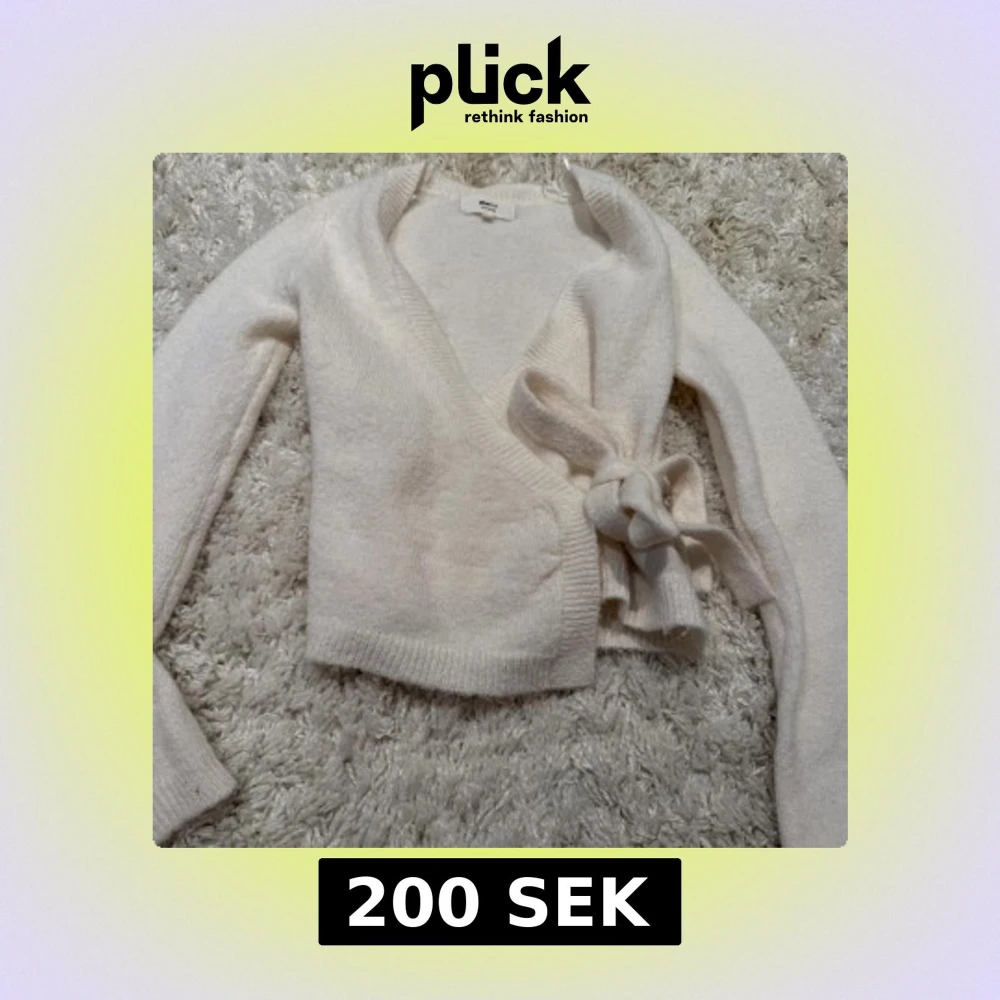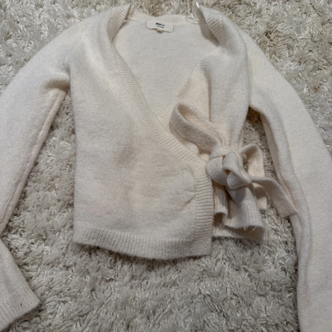 Supermjuk vit omlottkofta från Monki med långa ärmar och breda ribbade muddar. Koftan har en snygg knytning i sidan och är stickad i ett fluffigt material som känns riktigt cozy. Perfekt för lager-på-lager och chill dagar.