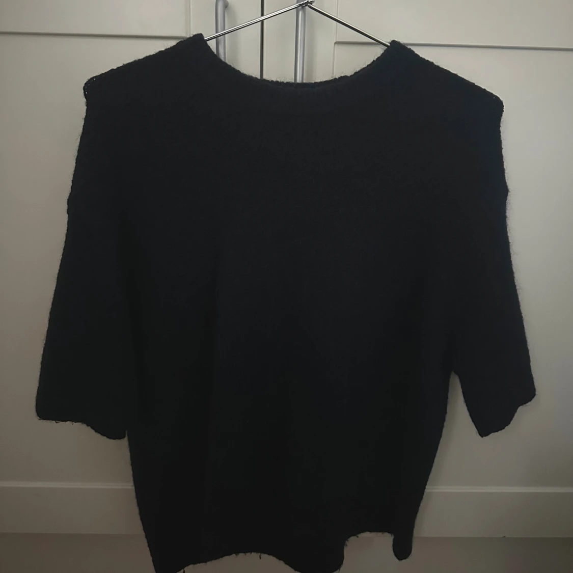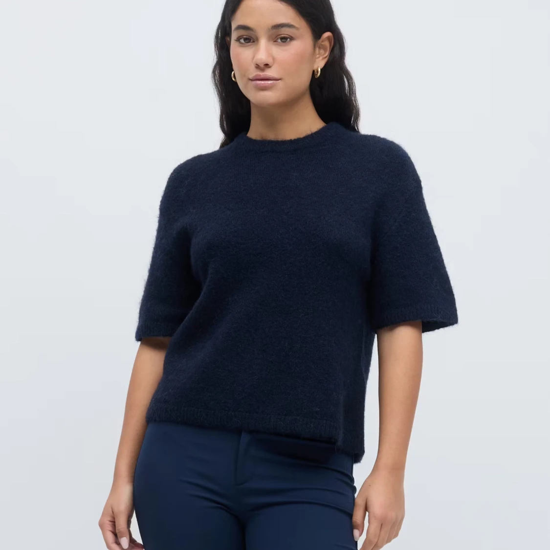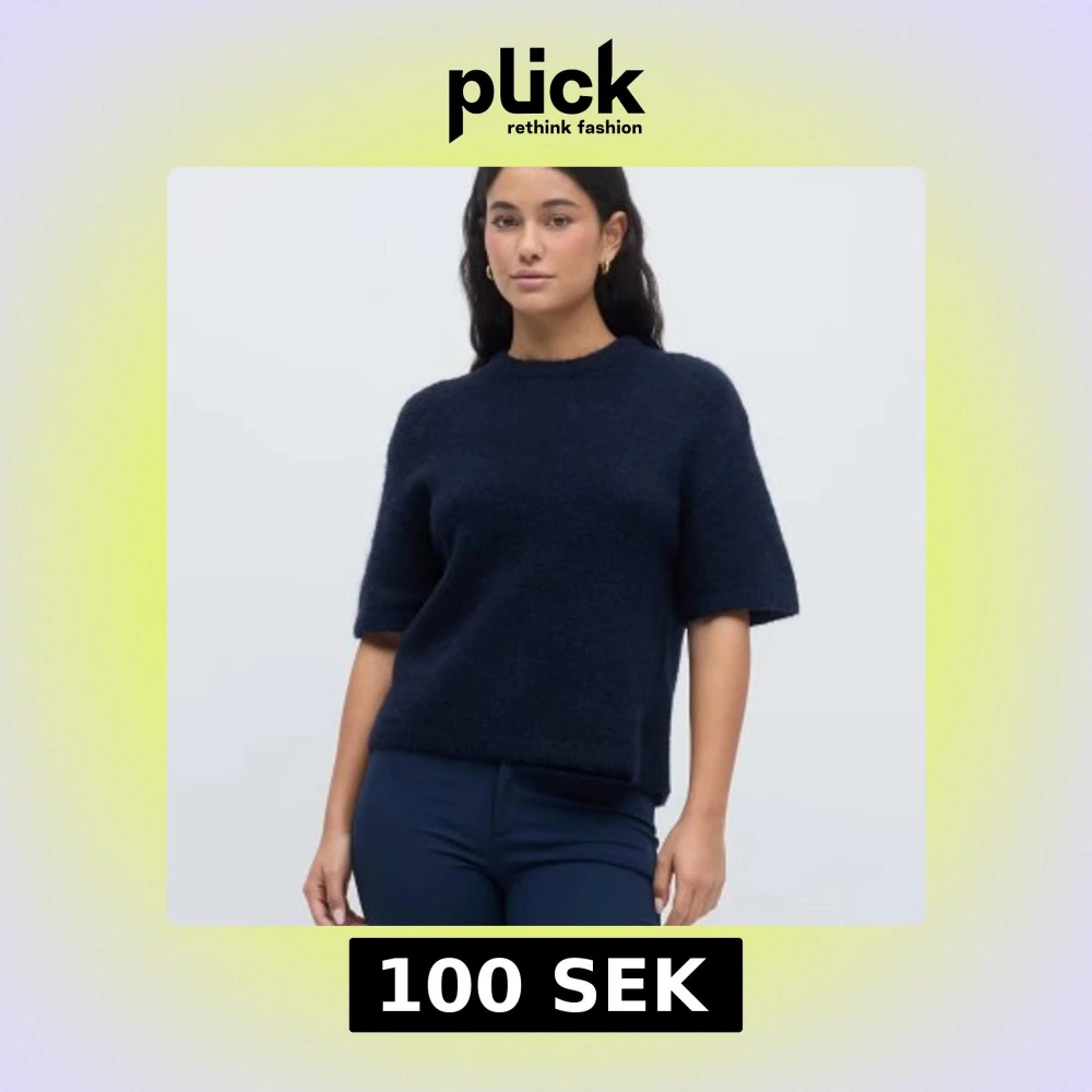 Mysig mörkblå stickad tröja med korta ärmar och rund hals. Tröjan har en enkel och stilren design, perfekt för lager-på-lager och funkar året runt. Materialet är fluffigt och ger en soft känsla. Passformen är normal och tröjan slutar vid höften.