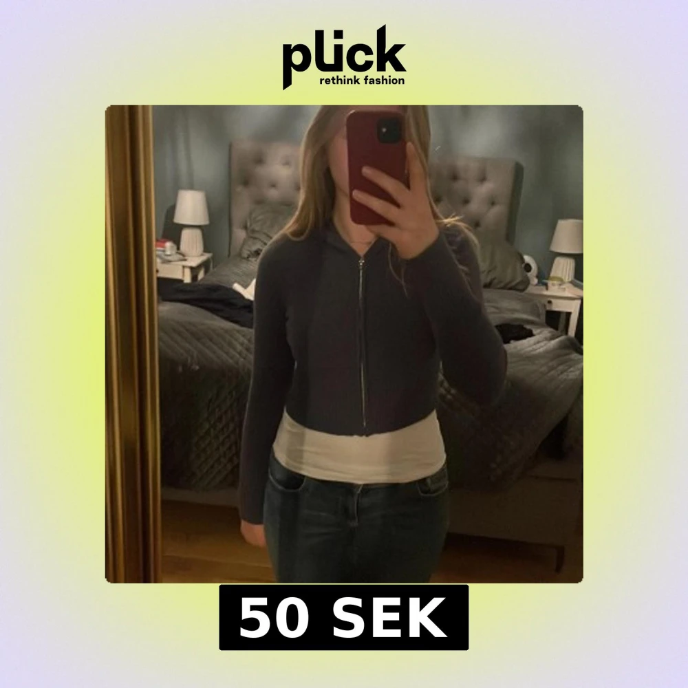 Säljer en mörkgrå/blå hoodie från Gina Tricot med dragkedja framtill. Den har långa ärmar och en bekväm passform.