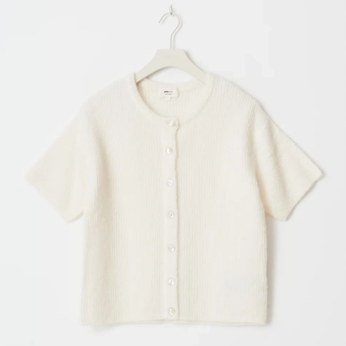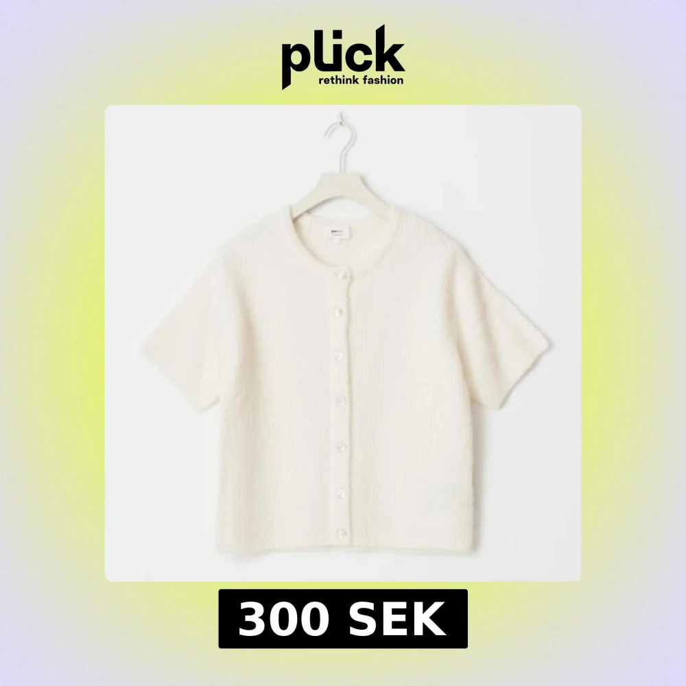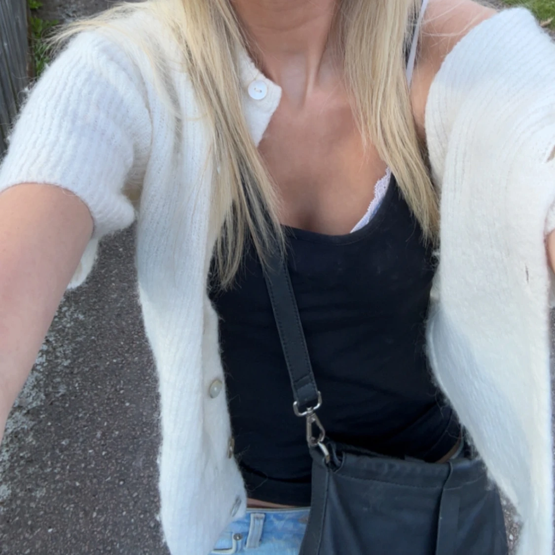 Superfin vit kofta från Gina Tricot med korta ärmar och rund hals. Koftan är stickad och har knappar framtill, perfekt att slänga över ett linne. Mjuk och skön, passar till både jeans och kjol.