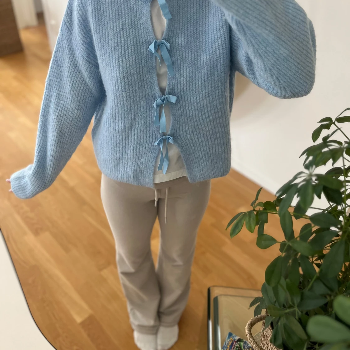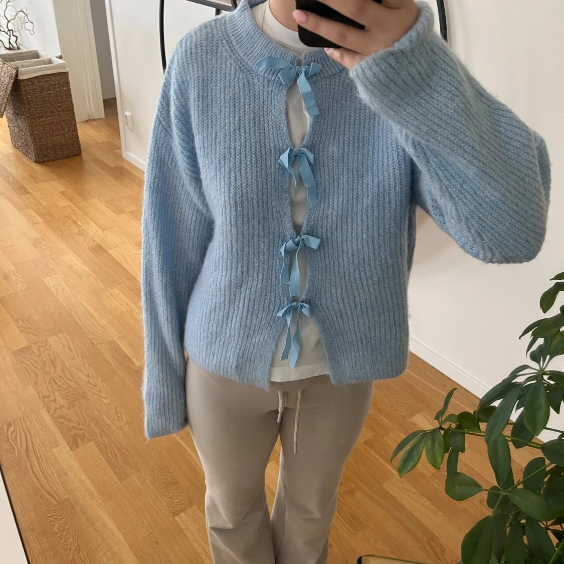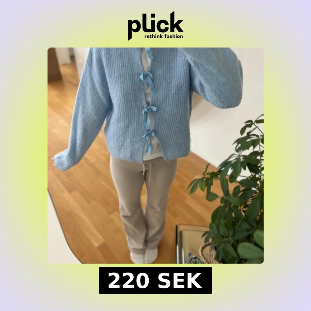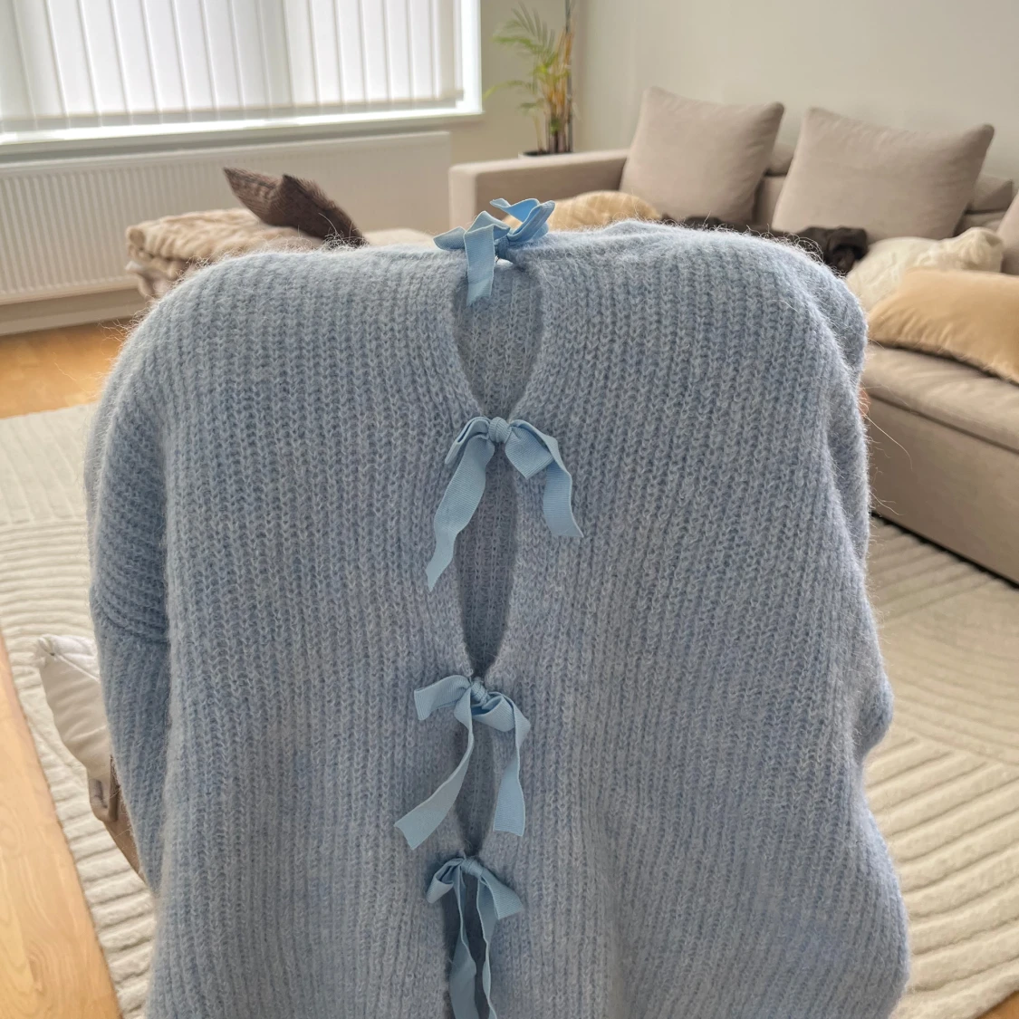 Superfin ljusblå stickad kofta med fyra söta rosetter framtill. Koftan har en loose passform och långa ärmar, perfekt för lager på lager. Mjuk och mysig, passar perfekt till både jeans och kjol.
