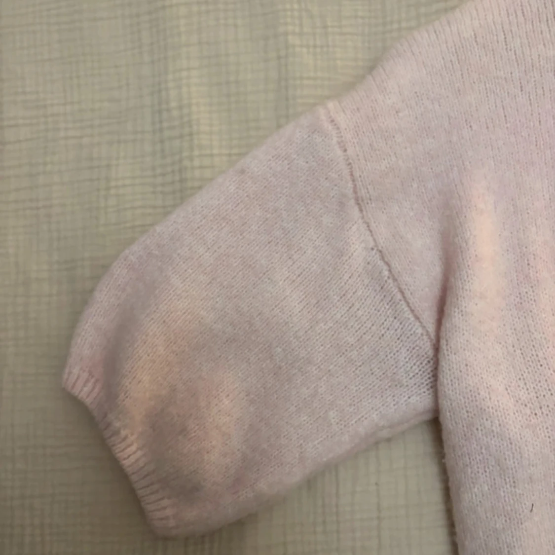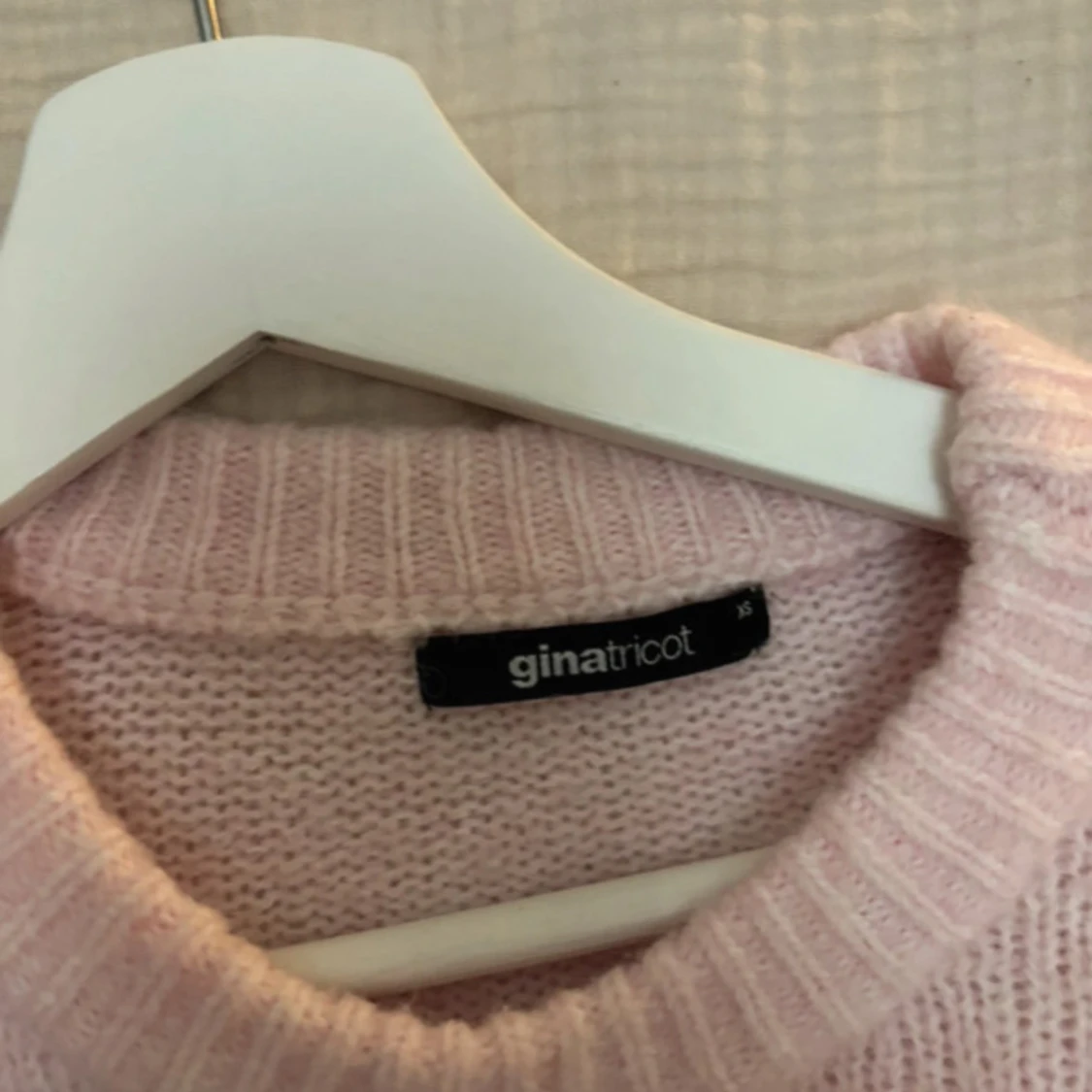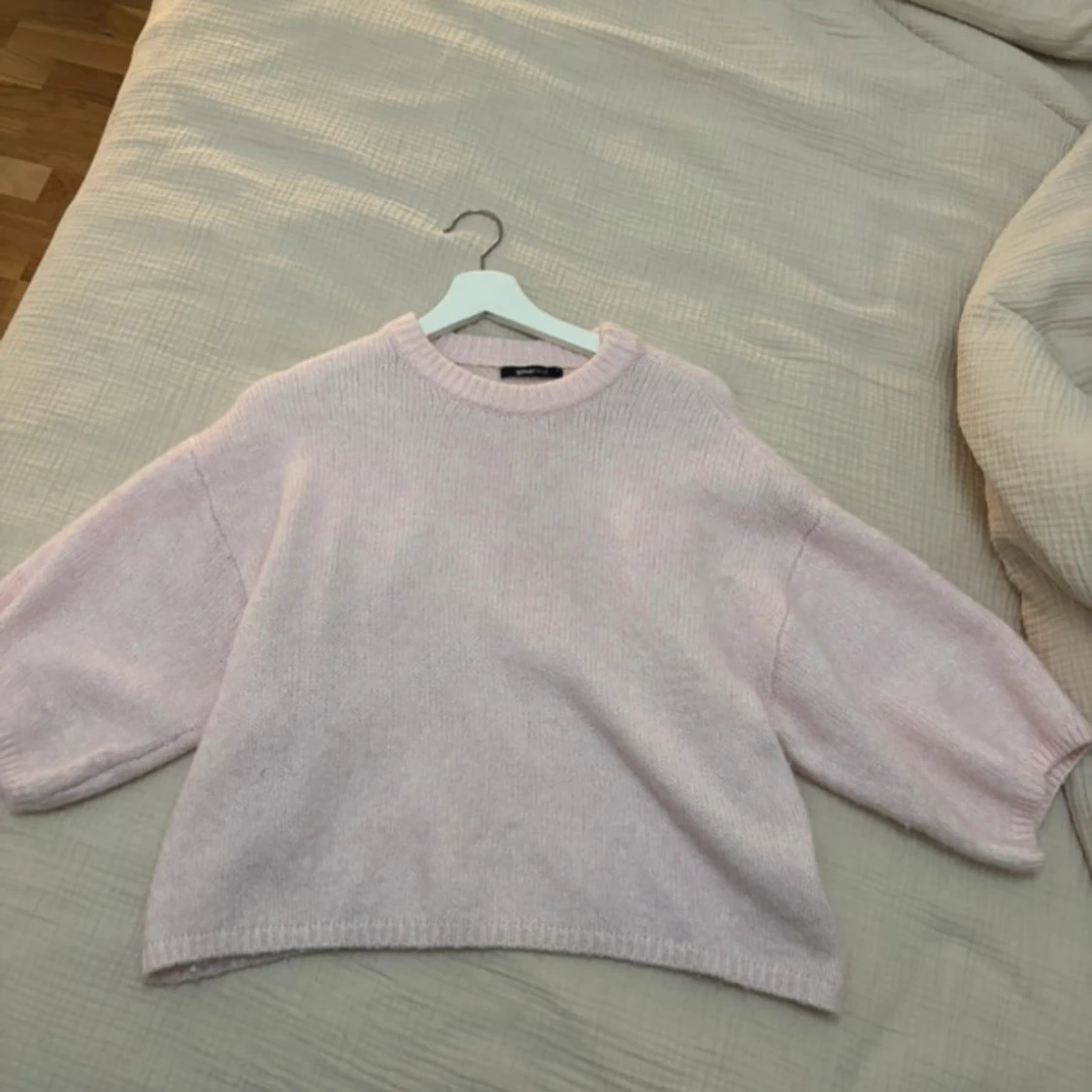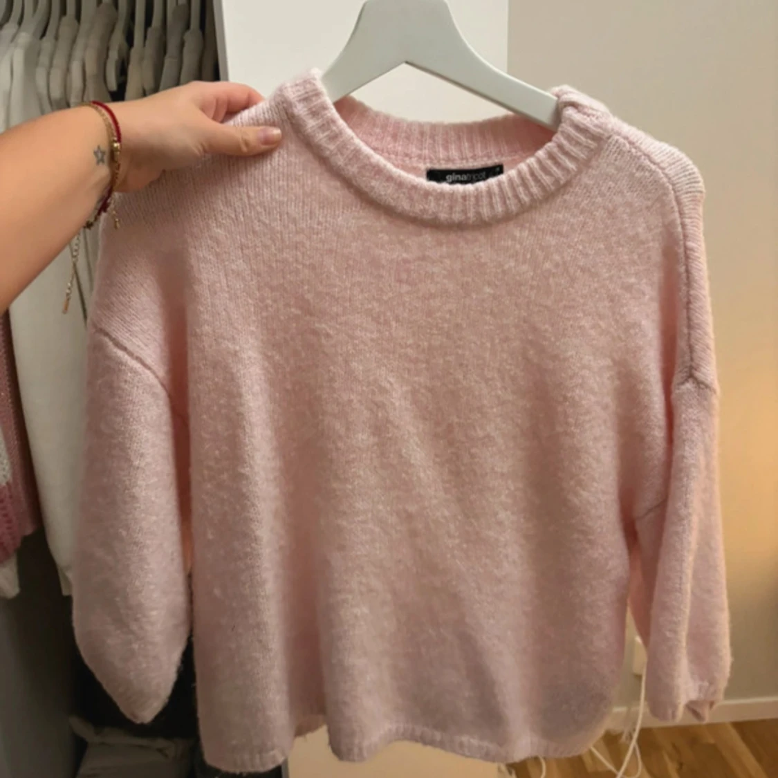 Supermysig ljusrosa stickad tröja från Gina Tricot. Tröjan har en rund halsringning, breda ärmar och en loose passform. Perfekt för lager på lager och chill dagar. Mjuk och fluffig känsla, enkel att matcha med jeans eller kjol.