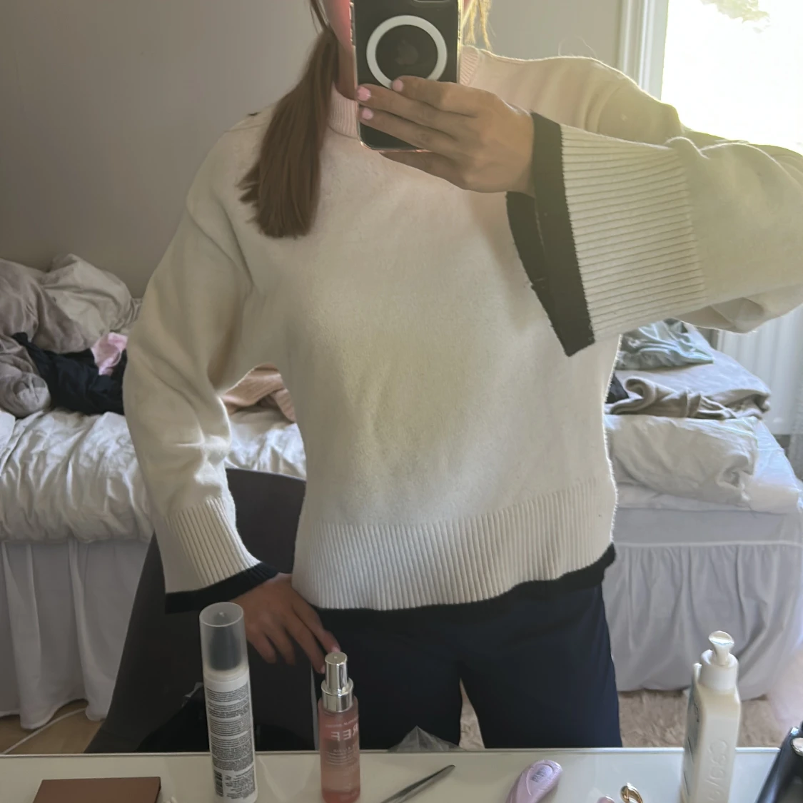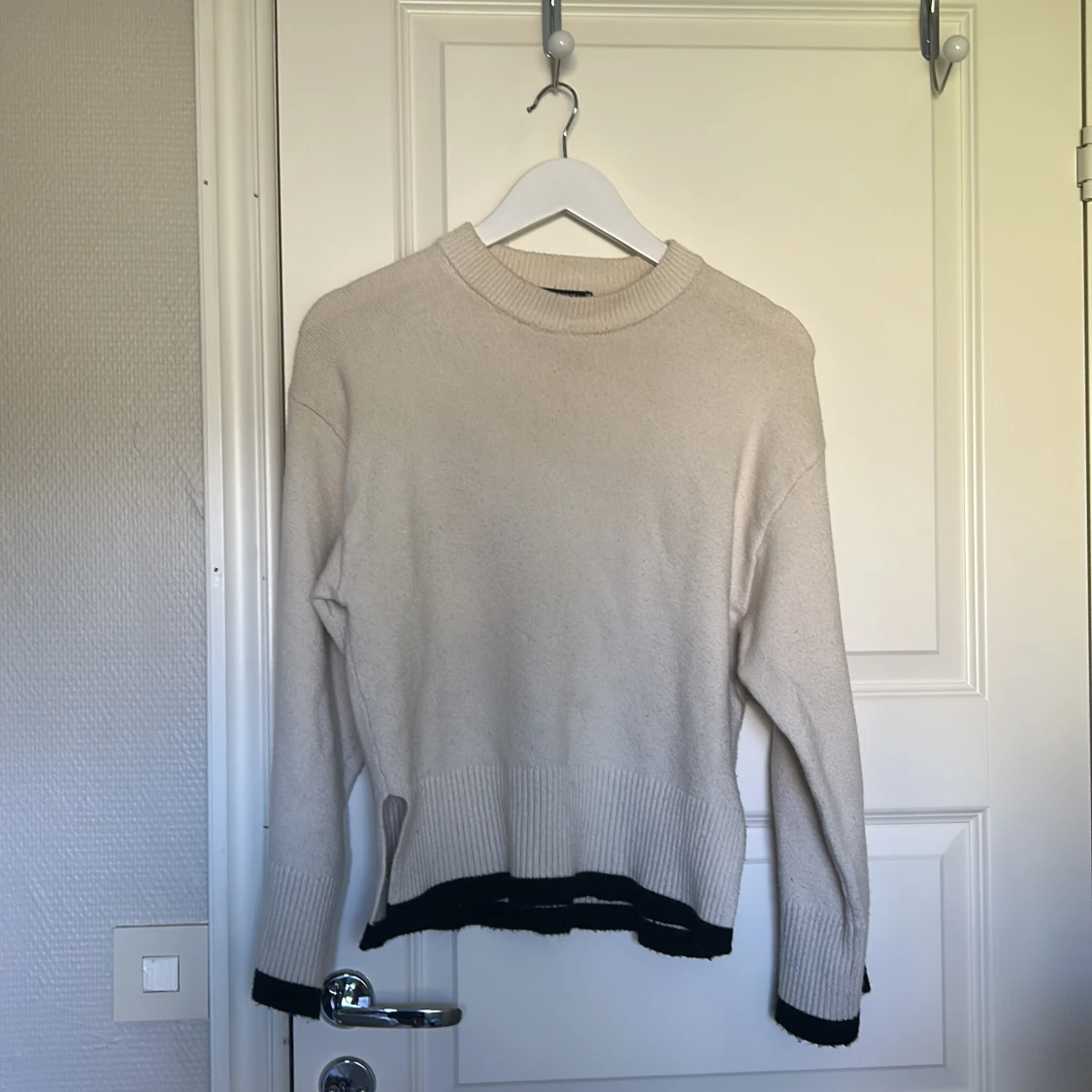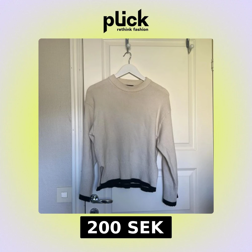 Säljer en beige stickad tröja med svarta ribbade kanter vid ärmslut och nederkant. Tröjan har en rund hals och långärmade, lite loose fit. Perfekt för dig som gillar enkel men snygg stil och vill ha något som funkar till jeans eller kjol.