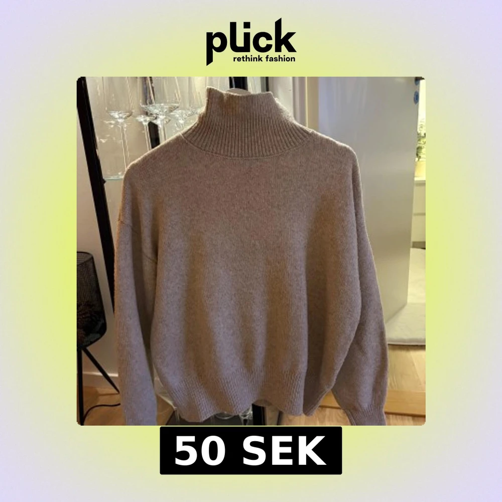 Säljer en mysig beige stickad polotröja med hög krage. Tröjan har långa ärmar och ribbade muddar vid ärmslut och nederkant.