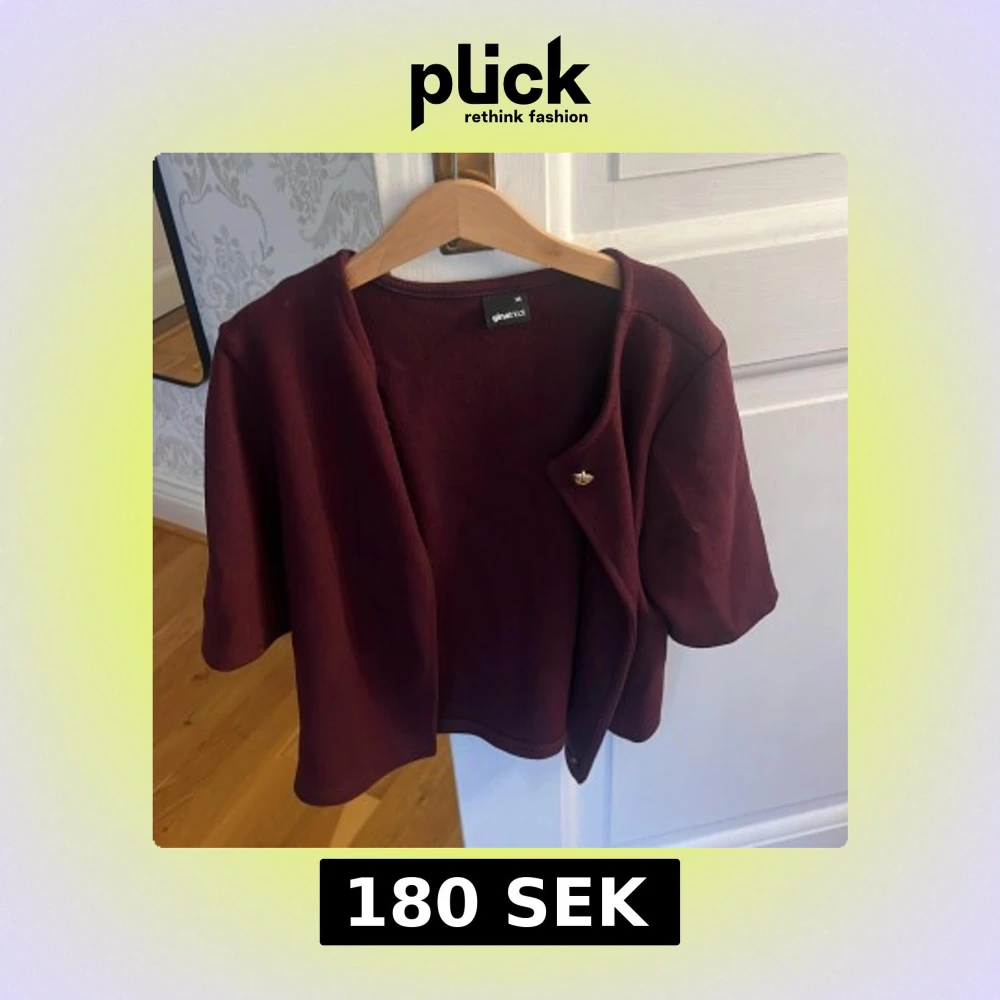 Kort vinröd cardigan kofta från Gina Tricot med öppen front och en liten guldfärgad knappdetalj. Koftan har korta ärmar och en loose passform, perfekt för lager-på-lager. Mjuk och skön känsla i materialet.