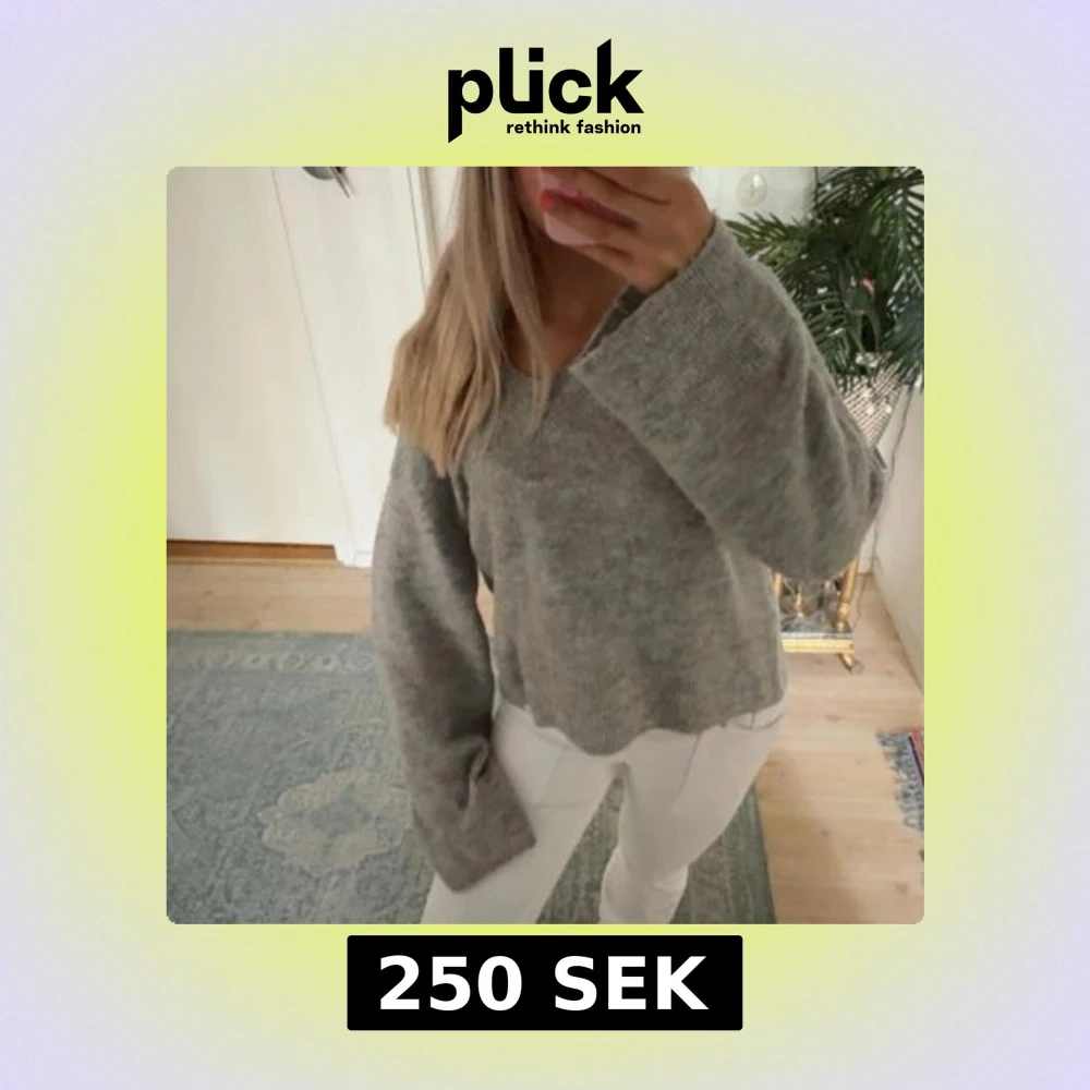 Mysig grå stickad tröja med v-ringad hals och långa utsvängda ärmar.