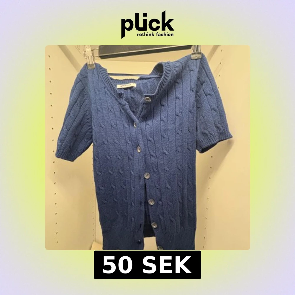 Mysig blå stickad kofta från Gina Tricot i storlek XS. Koftan har korta ärmar, kabelstickat mönster och knappar framtill. Perfekt att slänga över en topp för en chill look.